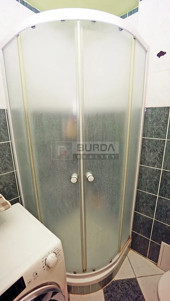 V koupelně je sprchový kout, WC, umyvadlo a přípojky pro pračku.