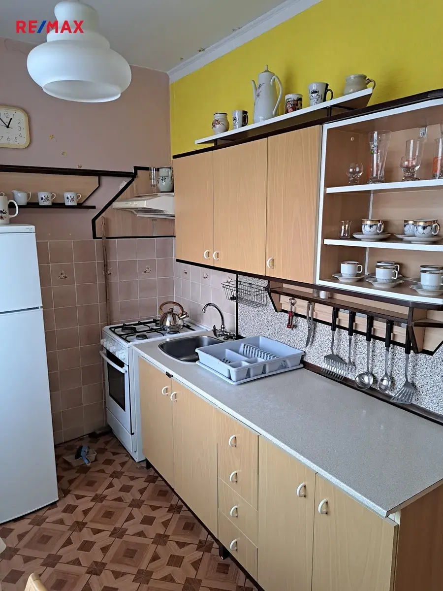 Byt sestává z předsíně, kuchyně, ložnice, obývacího pokoje, toalety a samostatné koupelny s vanou. Z obývacího pokoje je vstup na zasklenou lodžii o ploše 3 m2. V pokojích na podlahách parkety, v ostatních místnostech lino. V předsíni jsou prostorné vestavěné skříně. K bytu náleží sklep. Dálkové dodávky tepla a teplé vody.