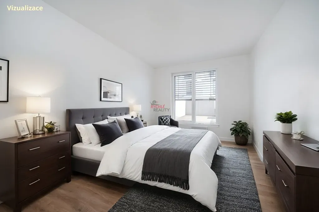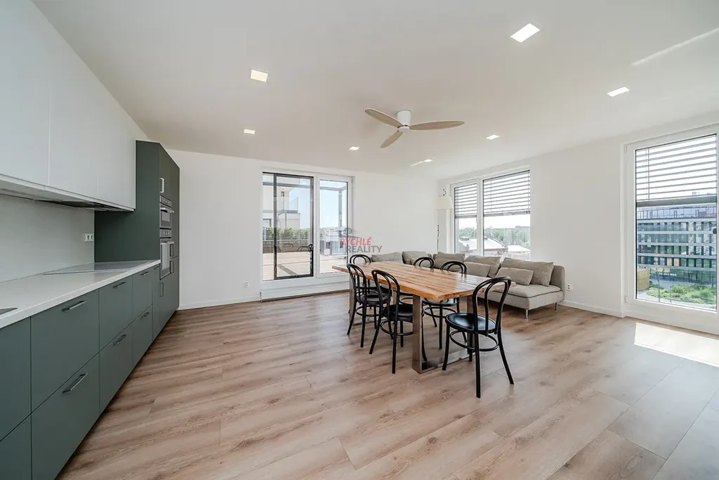 V bytě jsou pak další dvě samostatné ložnice, koupelna se sprchovým koutem, vanou i toaletou, další samostatná toaleta, komora (kde jsou umístěny pračka se sušičkou) a velkorysý obývací prostor s kuchyňským koutem se vstupem na terasu i lodžii.