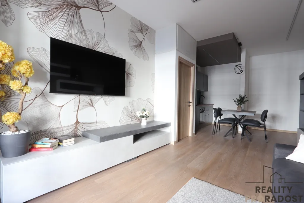 Po vstupu vás přivítá světlý obývací pokoj s přímým vstupem na prostornou terasu, která nabízí příjemné venkovní posezení a klidné prostředí ideální k odpočinku.
