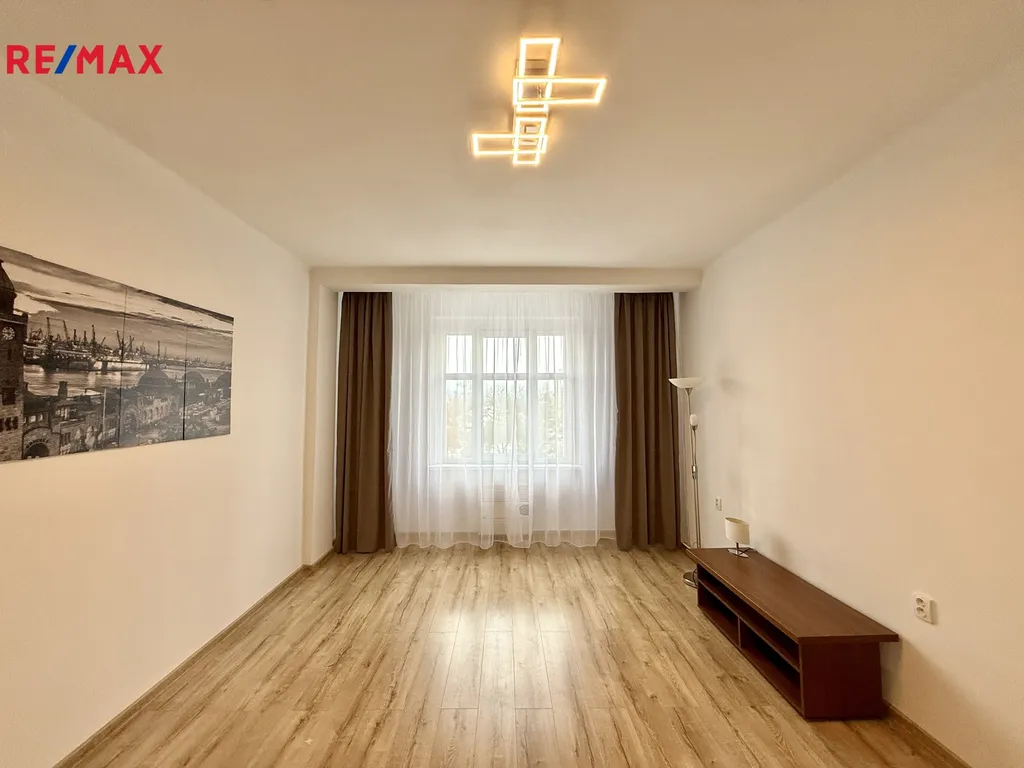 Byt je velmi světlý a nabízí krásný výhled na kostel v Rybářích, což dodává interiéru příjemnou atmosféru.