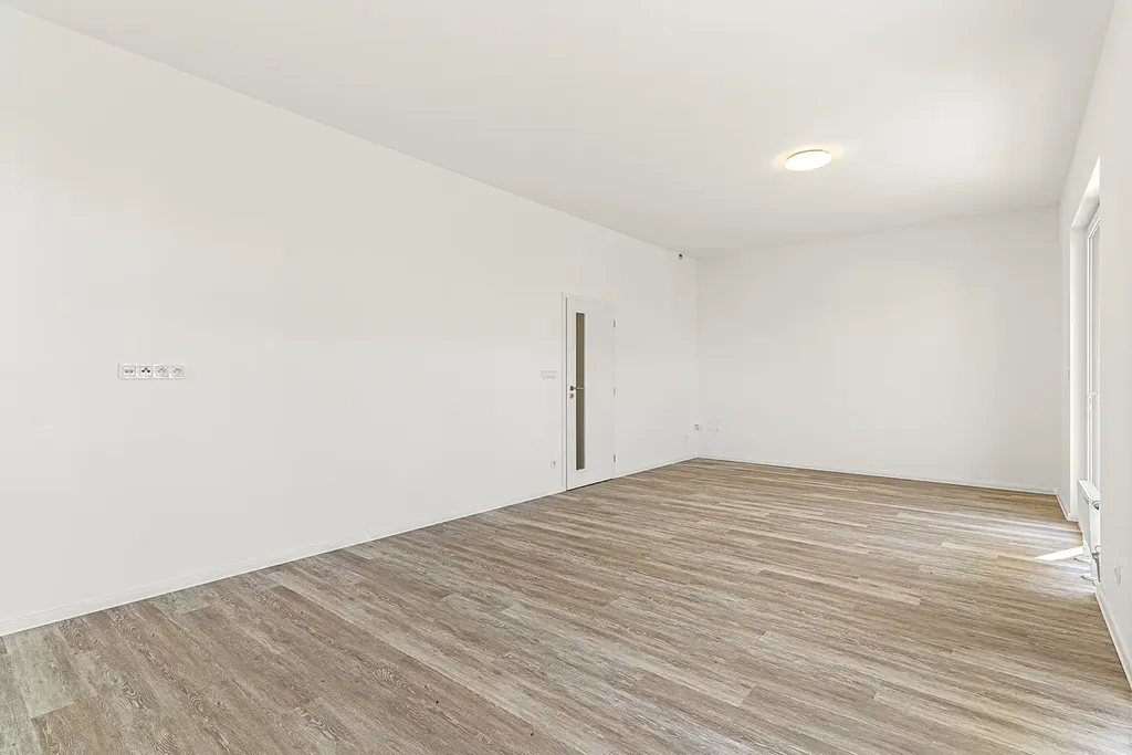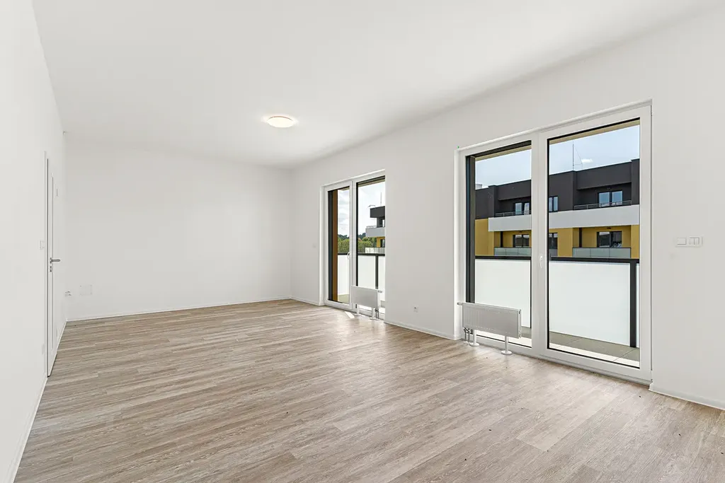 Srdcem bytu je prostorný obývací pokoj s kuchyňským koutem, který se otevírá na terasu o rozloze 20 m², orientovanou na jihovýchod. Díky této orientaci je obytný prostor příjemně prosvětlený od ranních hodin a terasa se stává ideálním místem pro snídani na čerstvém vzduchu, hry s dětmi či večerní posezení. Ložnice a druhý pokoj, orientované na severovýchod, poskytují klidné zázemí pro odpočinek i soustředěnou práci.