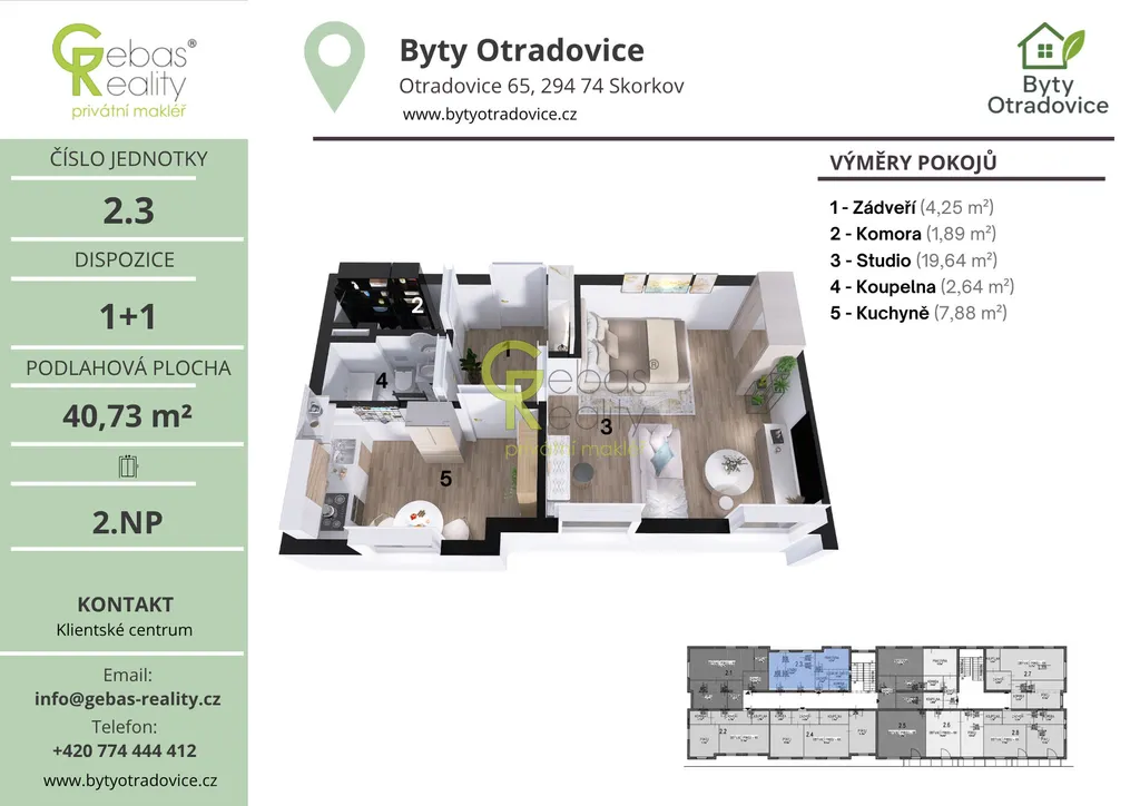 Ve výhradním zastoupení si Vás dovolujeme oslovit nabídkou moderní bytové jednotky o dispozici 1+1 a celkové užitné ploše 38,6 m², která se nachází v kompletně zrekonstruovaném bytovém domě v obci Otradovice – Skorkov pouhých 5 minut od Brandýsa nad Labem – Staré Boleslavi. Projekt Byty Otradovice zahrnuje celkem 16 bytových jednotek různých velikostí a nabízí kvalitní a komfortní bydlení v klidné lokalitě s výbornou dostupností do Prahy, Brandýsa nad Labem – Staré Boleslavi i Mladé Boleslavi. Součástí kupní ceny je parkovací stání před domem, kuchyňská linka vyrobená na míru od truhláře včetně vestavných spotřebičů, kompletní sanita v koupelně značky JIKA a zděný sklep o minimální ploše 15 m² umístěný v suterénu domu.