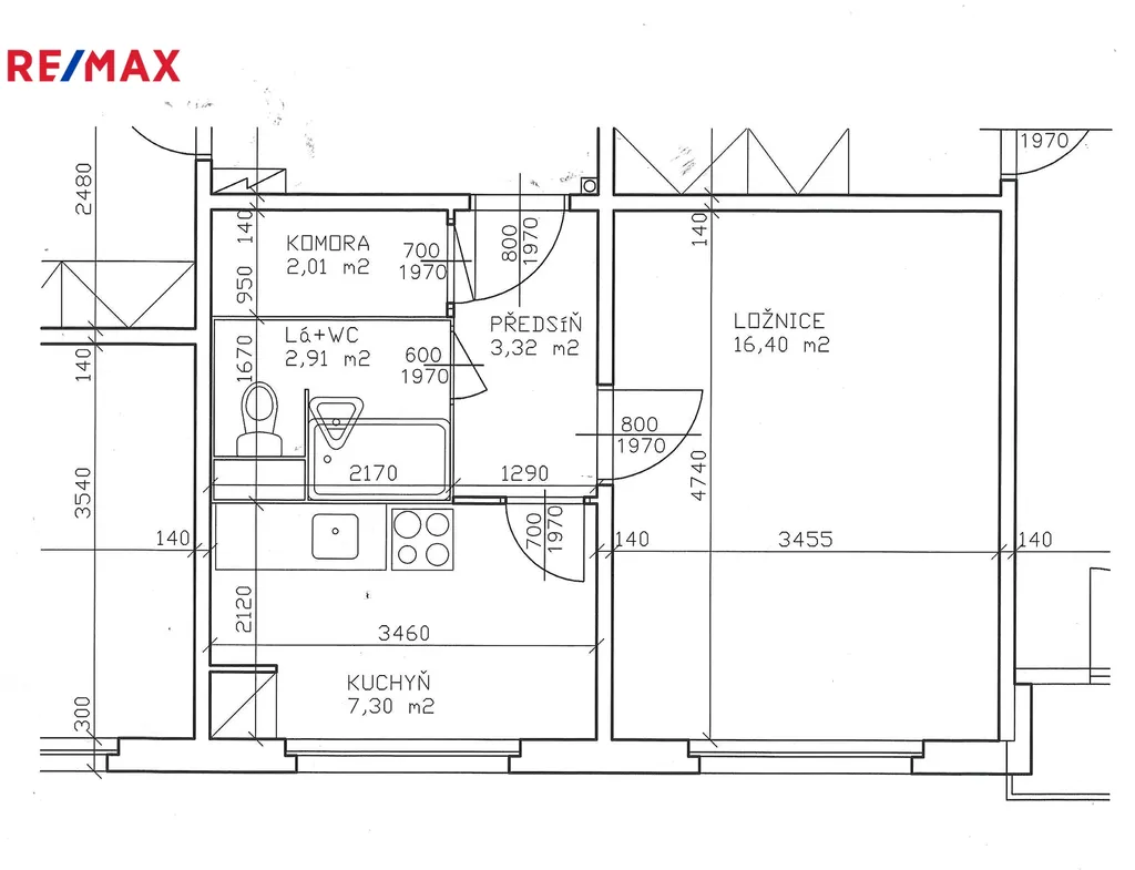 Byt je situován do 1. NP panelové budovy, a jeho celková podlahová plocha činí 34,8 m2.