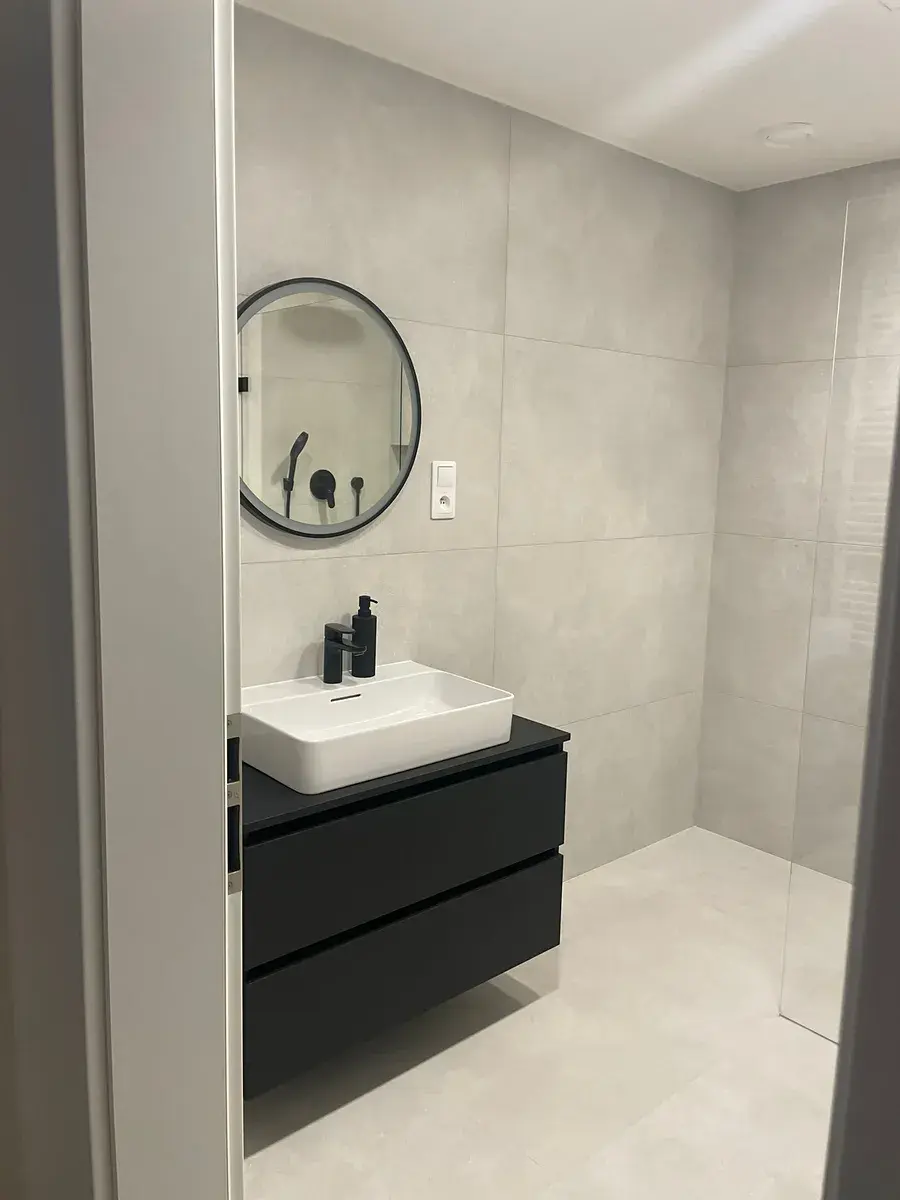 Dispozice bytu je velmi praktická a promyšlená. Vstupní chodba je vybavena vestavěným nábytkem na míru. Z chodby je vstup do komory, která slouží jako úložný i technický prostor – je zde vestavěná skříň, místo na pračku a příprava pro sušičku. Koupelna a toaleta jsou oddělené. Koupelna je provedena v designu Laufen, se zrcadlem s LED osvětlením a komfortním walk-in sprchovým koutem s podomítkovou baterií a tropickou sprchou.