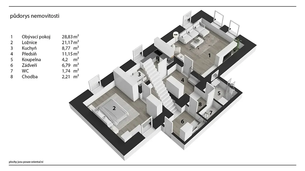 Přízemí nabízí tři místnosti, z čehož největší je budoucí obývací pokoj o velikosti téměř 29 m², dále samostatná kuchyně cca 9 m² a pokoj o velikosti 21 m² vhodný jako ložnice, pracovna nebo pokoj pro hosty.