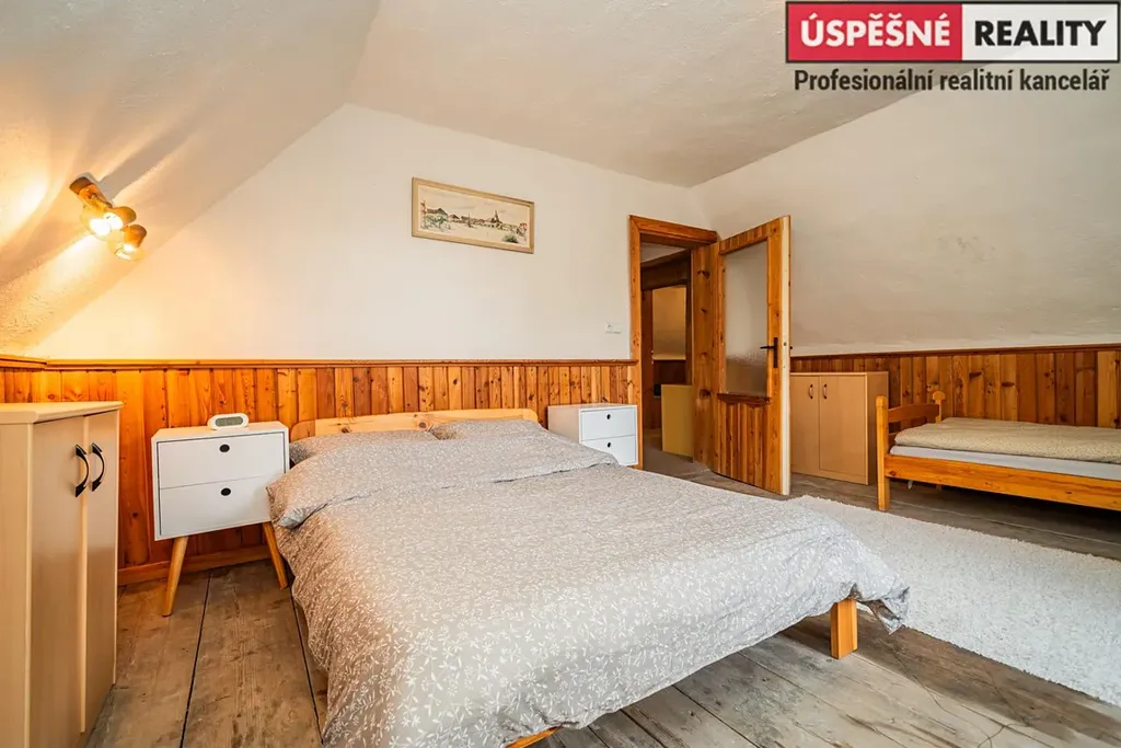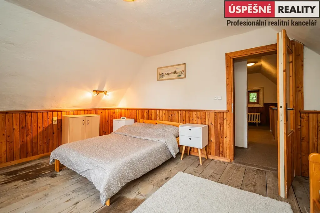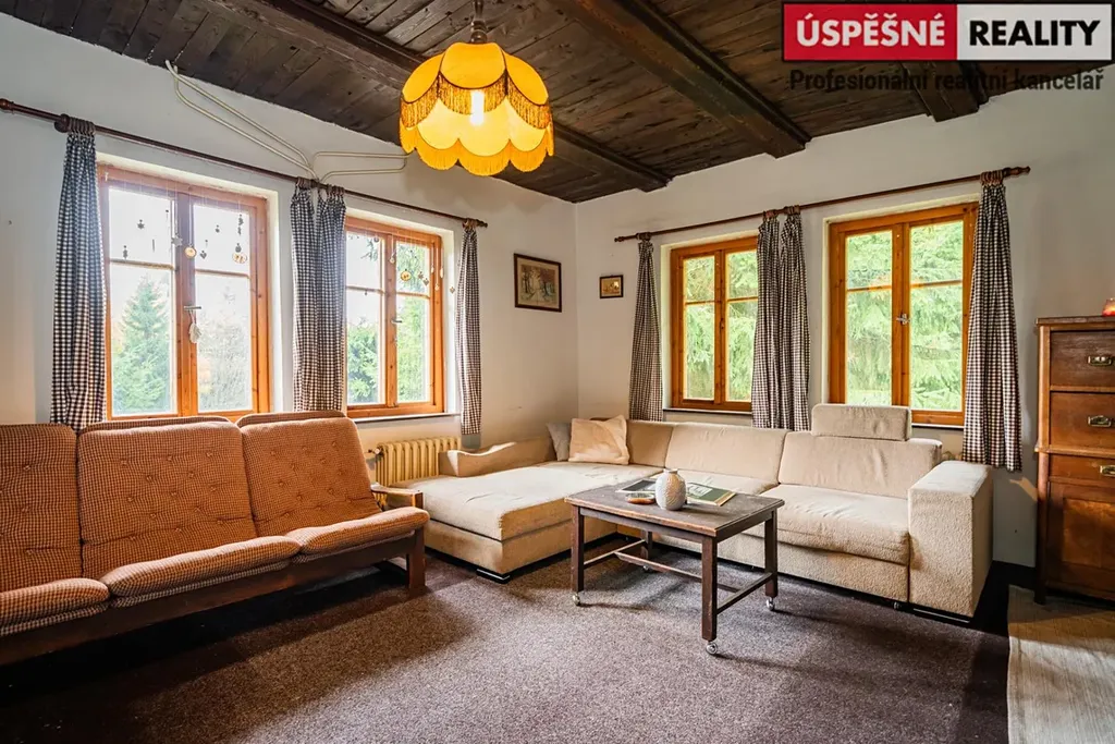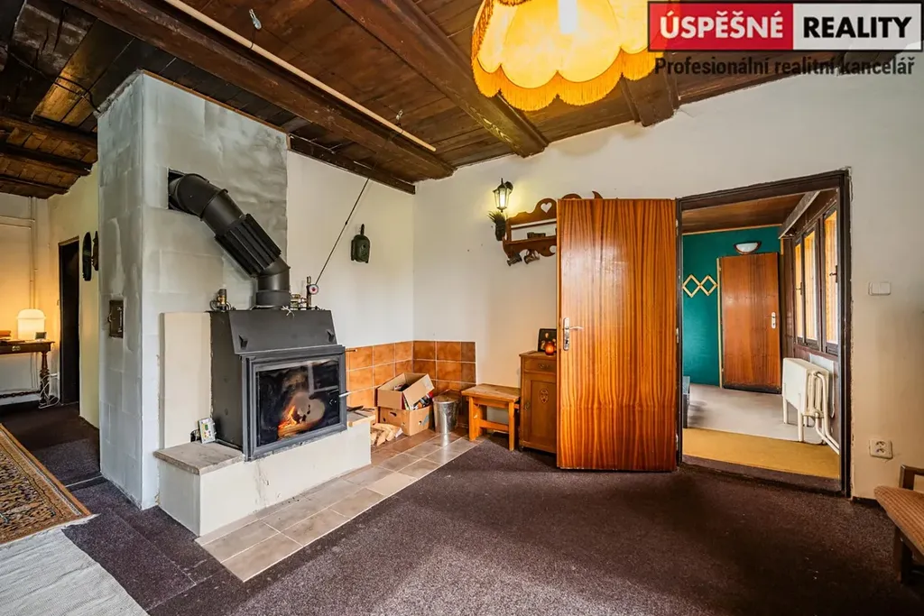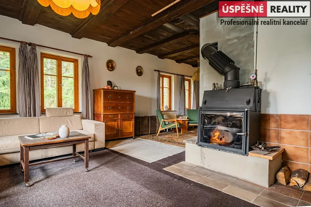 Hlavní komunikační prostor a srdce této nemovitosti tvoří velkoryse řešený obývací pokoj s krbovými kamny v přízemí, podkrovní část pak disponuje čtyřmi samostatnými ložnicemi. Vytápění objektu je zajištěno již zmíněnými krbovými kamny s výměníkem, v kombinaci s elektrokotlem na dálkové ovládání, voda je do něj přivedena z místního pramenu. Odpady jsou svedeny do septiku. Chata je situovaná na polosamotě a obklopená lesy a přírodou. Jednu z hranic pozemku lemuje malý potůček.