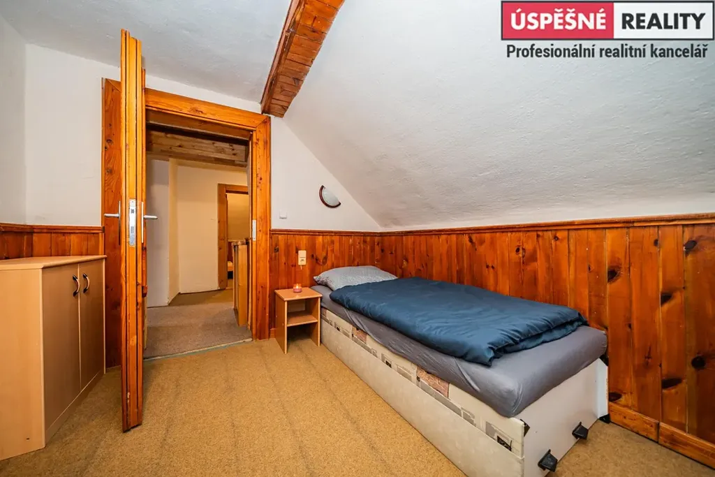 Dřevěná chata s kamennou podezdívkou o dispozici 5+1, stojí na jižním svahu nejvyšší hory Krušných hor Klínovci, nad klidnou obci Suchá u Jáchymova. Dispozice: 1.NP: Zasazen do svahu garáž nyní využívána jako dílna, technická místnost, kotelna 2.NP Vstupní veranda, chodba, obývací pokoj, kuchyň s jídelnou, spíž, WC a koupelna. 3.NP 4x ložnice. 4.NP Půda, z části zateplená.