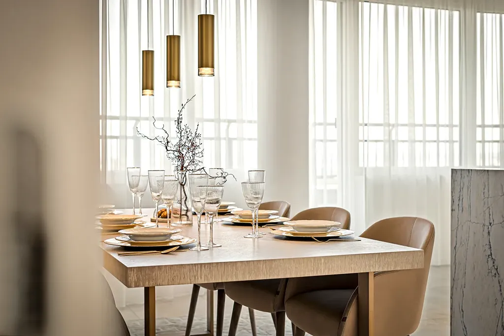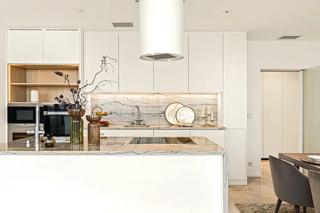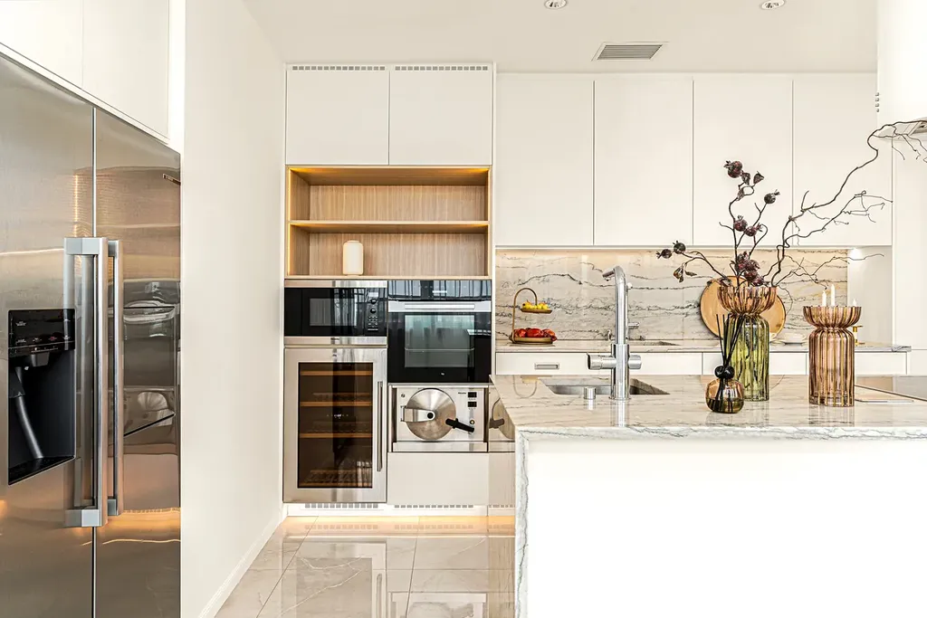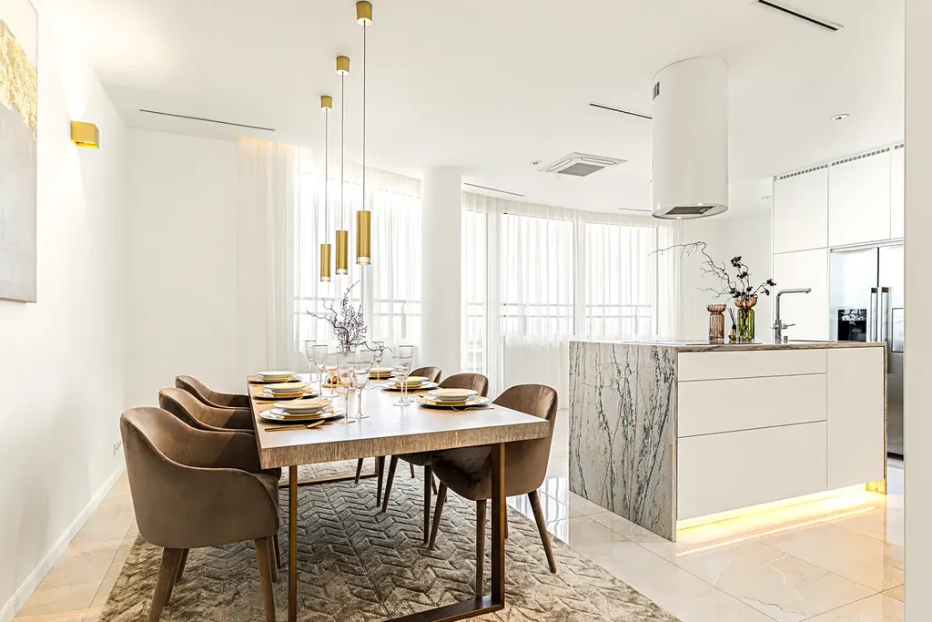 Výjimečné gurmánské zážitky vás čekají v designové kuchyni o rozloze 36 m², která je spojena s jídelnou. Vybavena je kvalitními spotřebiči Bosch a Miele. Nechybí americká lednice, luxusní vestavné spotřebiče ani vlastní vinotéka.