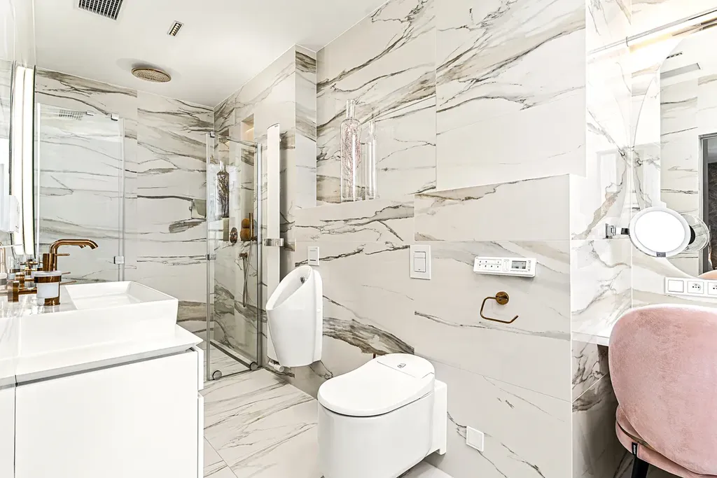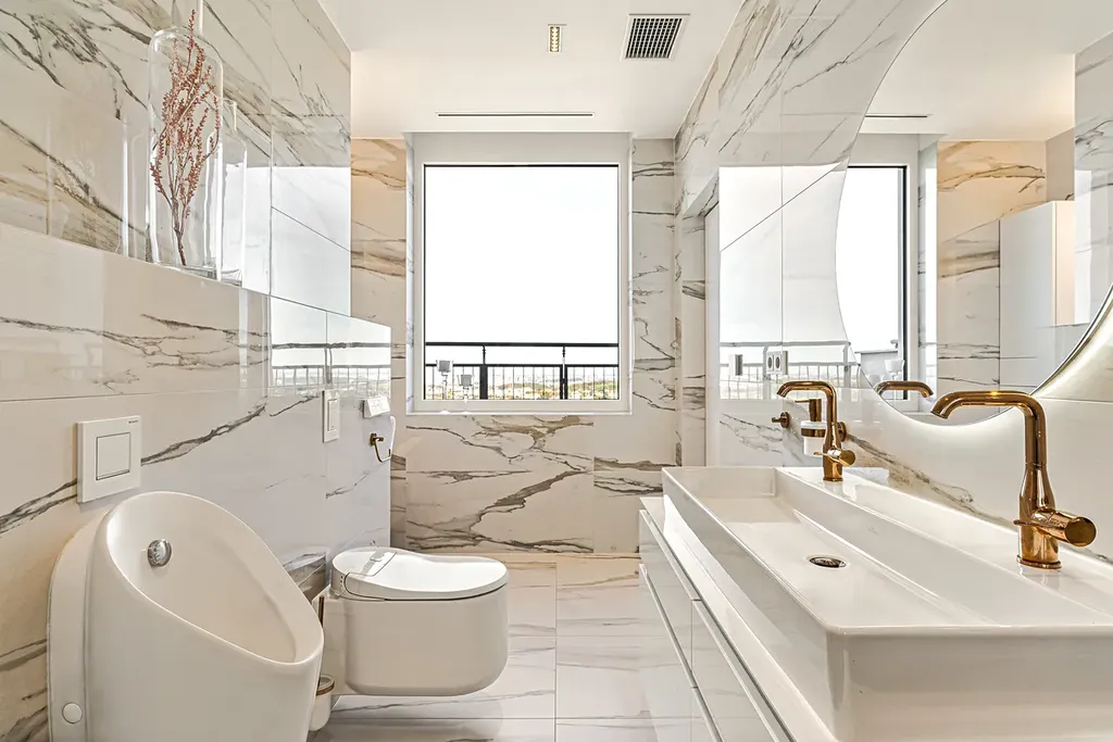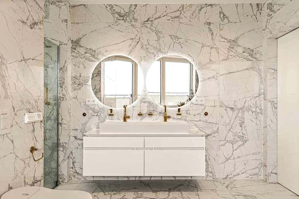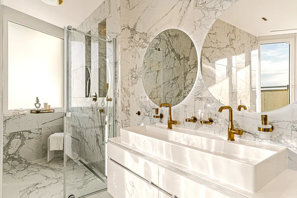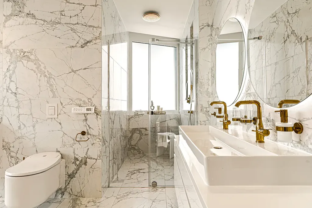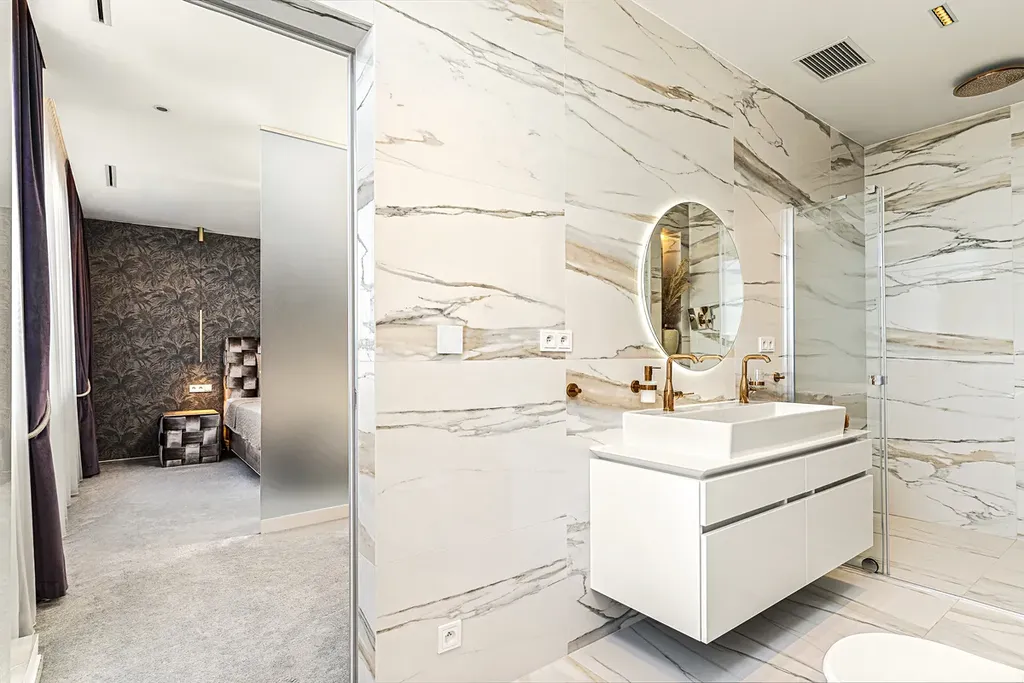 Obě koupelny jsou vybaveny těmi nejluxusnějšími zařizovacími předměty: velkorysými sprchovými kouty, chytrými toaletami Grohe a velkoformátovými obklady – vše tvoří jedinečnou atmosféru.