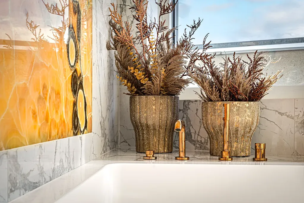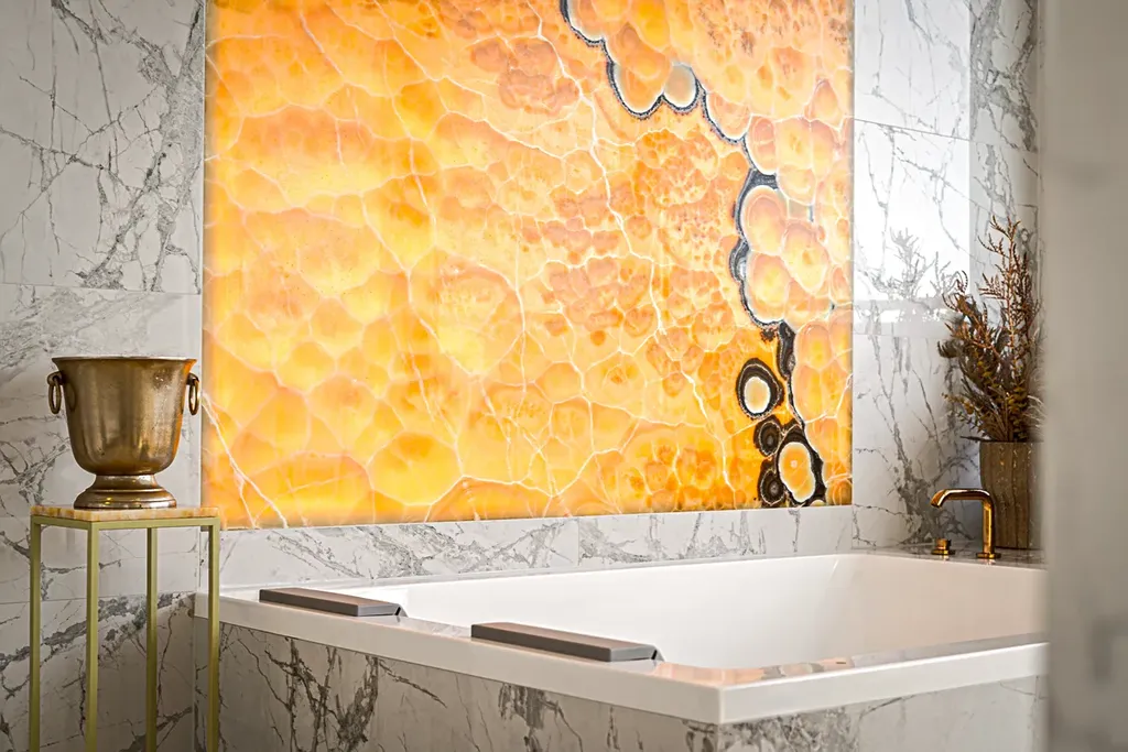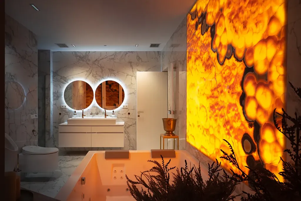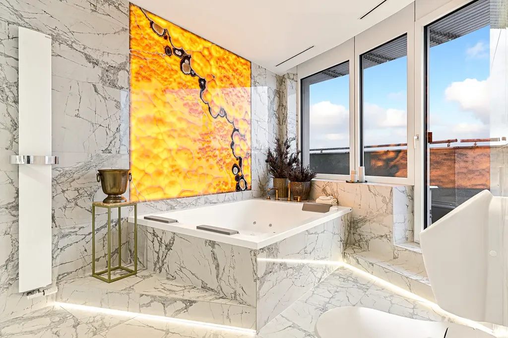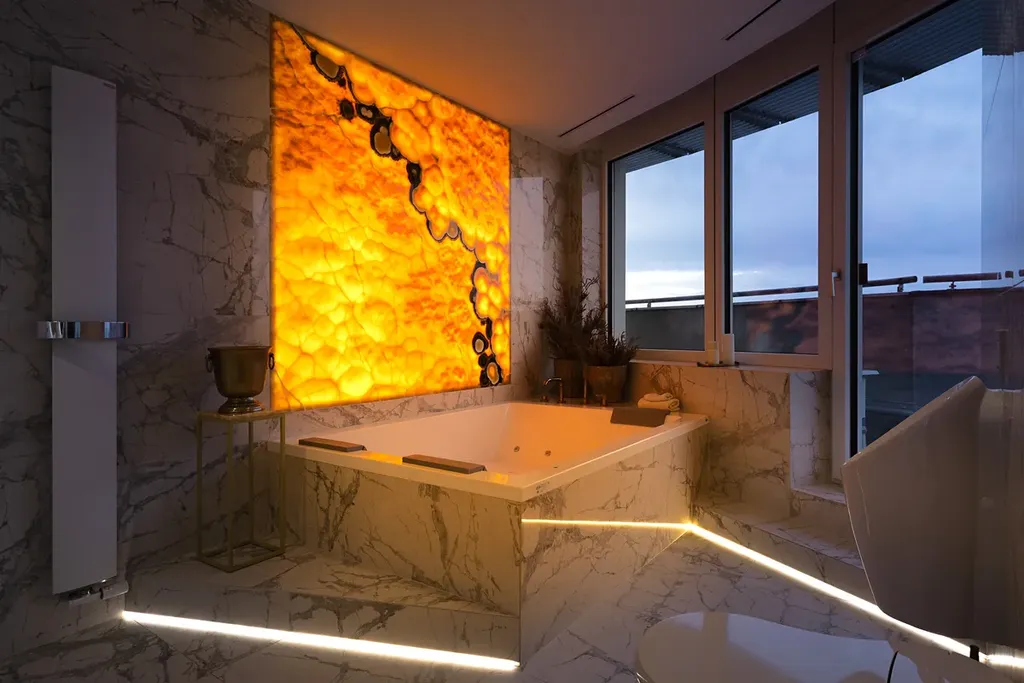 Zážitek vám přinese také každá chvíle strávená ve vašem domácím wellness, ve kterém najdete vířivku Jacuzzi a onyxový obklad s podsvětlením jako mistrovské dílo designu. Místnost je navíc situována na západ, což při západu slunce podtrhne celkovou atmosféru.