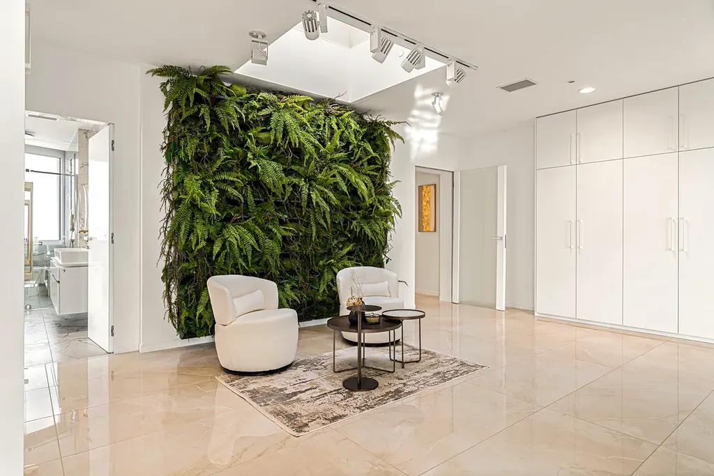 Příjemné chvíle s rodinou nebo přáteli si budete užívat v prostorném, luxusně vybaveném obývacím pokoji o velikosti 45 m², který je orientován na jih. Moderní žulový krb a kožená sedací souprava od ikonické italské značky Natuzzi. Dokonalou atmosféru doplňuje klimatizace, rekuperace a podlahové vytápění v celém bytě.