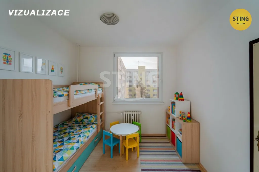 Byt disponuje klasickou dispozicí: prostorný obývací pokoj, oddělená kuchyně, dva samostatné pokoje, které lze využít jako ložnici a dětský pokoj, koupelna a WC. Dominantou bytu je prostorná lodžie, která nabízí nádherný výhled na město Krnov a okolní krajinu.