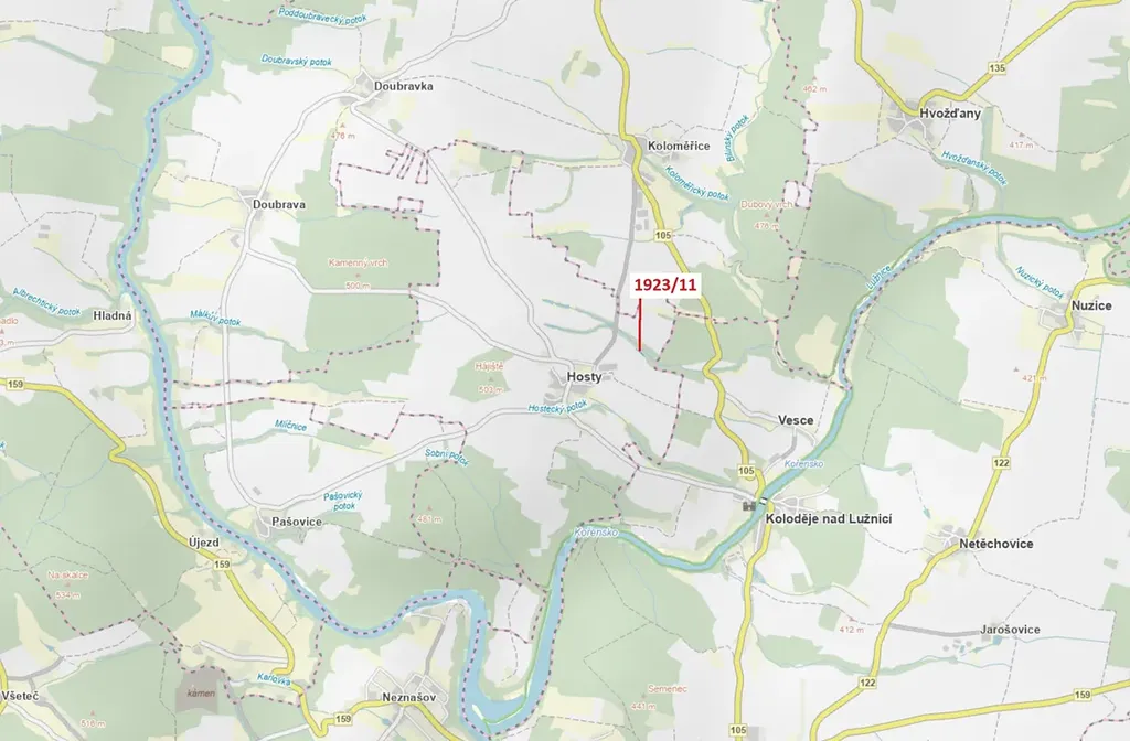Lesní pozemek o výměře 323 m2, parcelní číslo 1923/11, podíl 1/1, katastrální území Hosty, obec Hosty, obec s rozšířenou působností Týn nad Vltavou, okres České Budějovice, Jihočeský kraj.