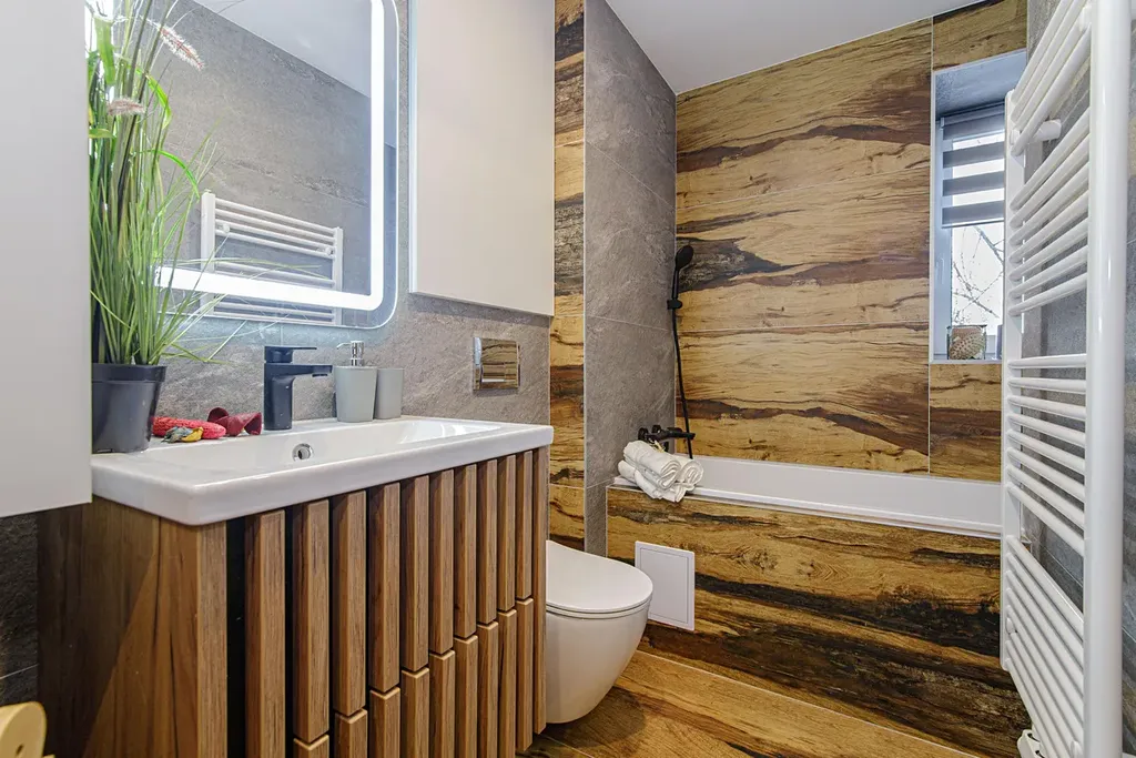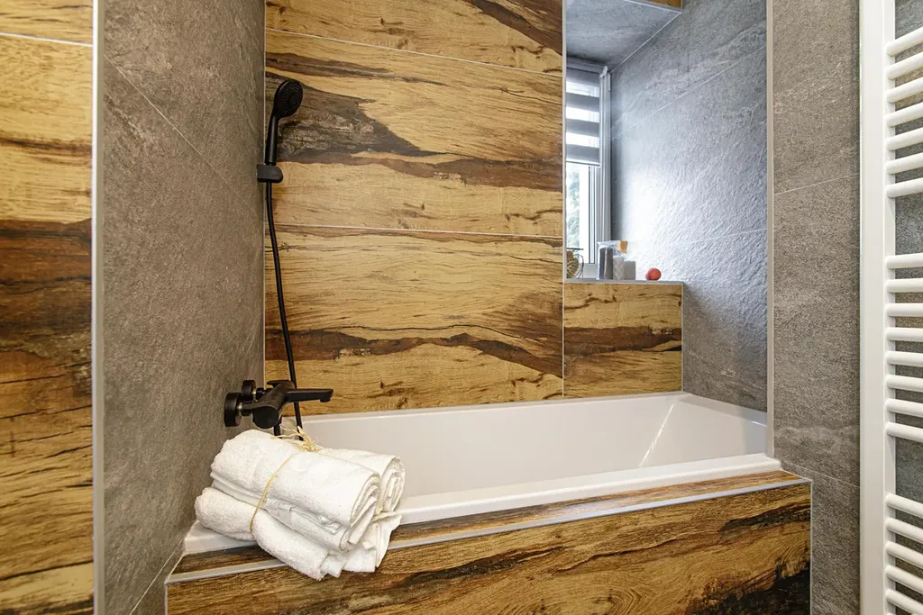 Koupelna s oknem včetně obkladů a dlažby, které k sobě ladí, nová sanita, prostor na umístění pračky.