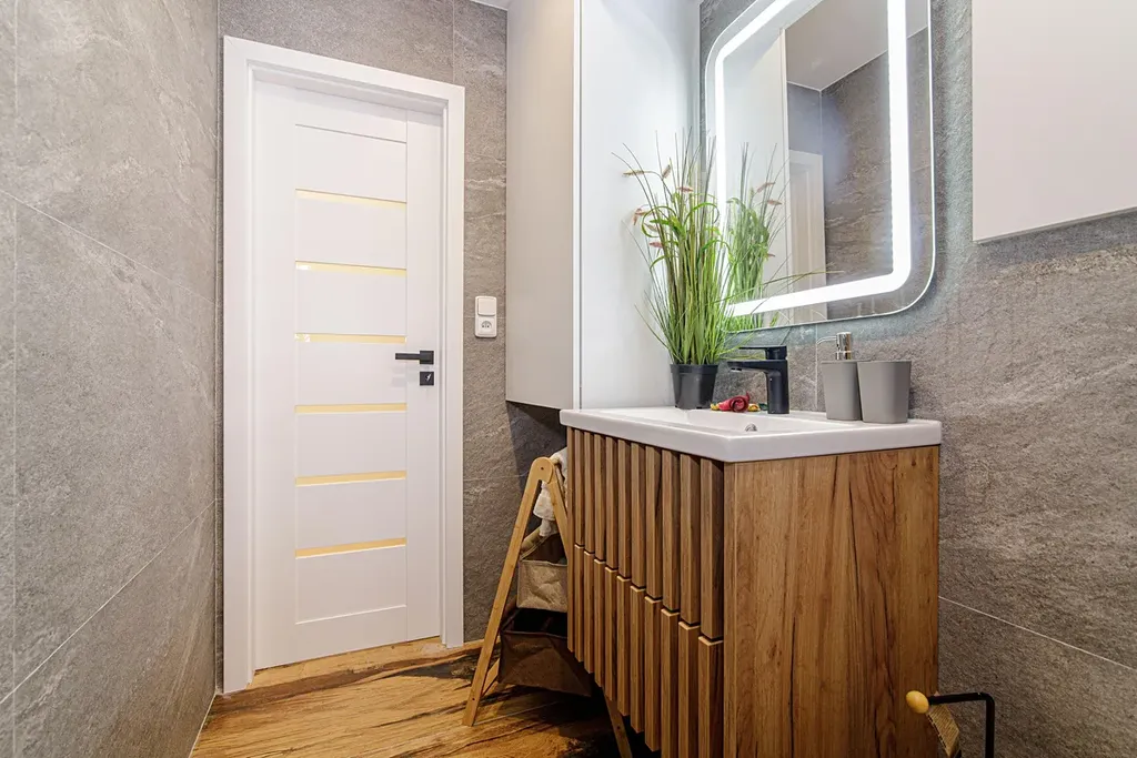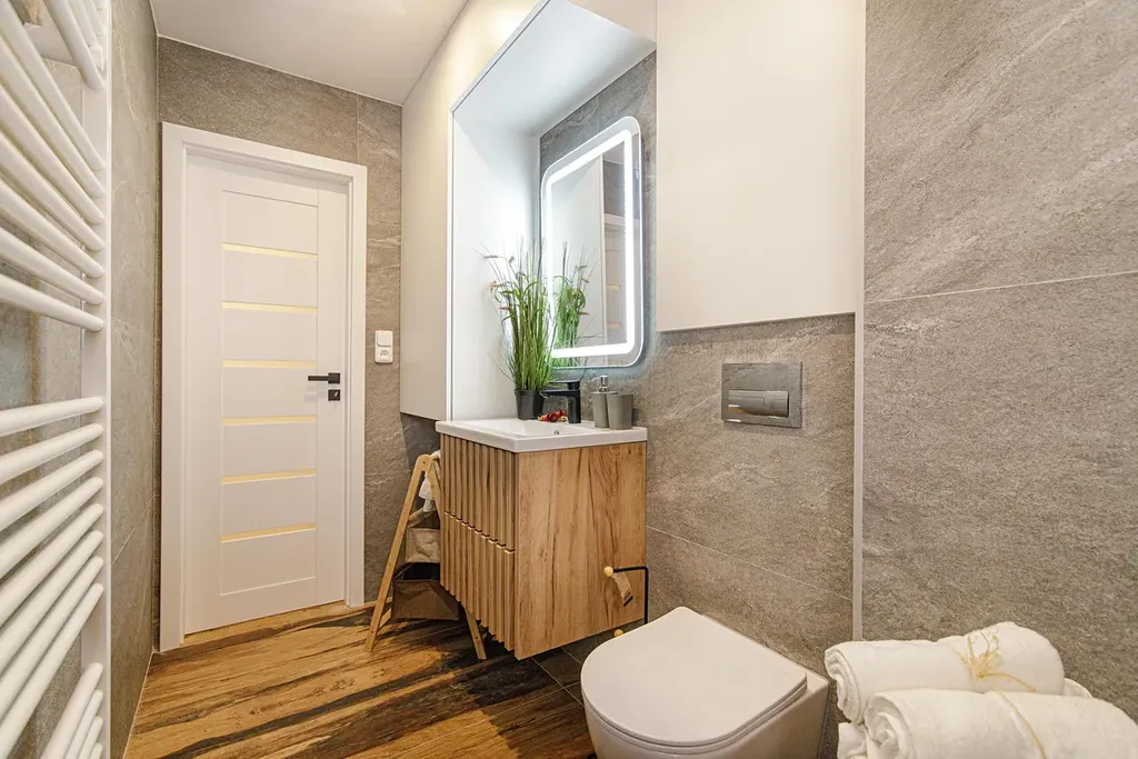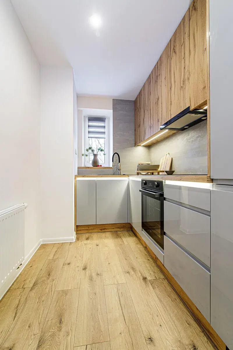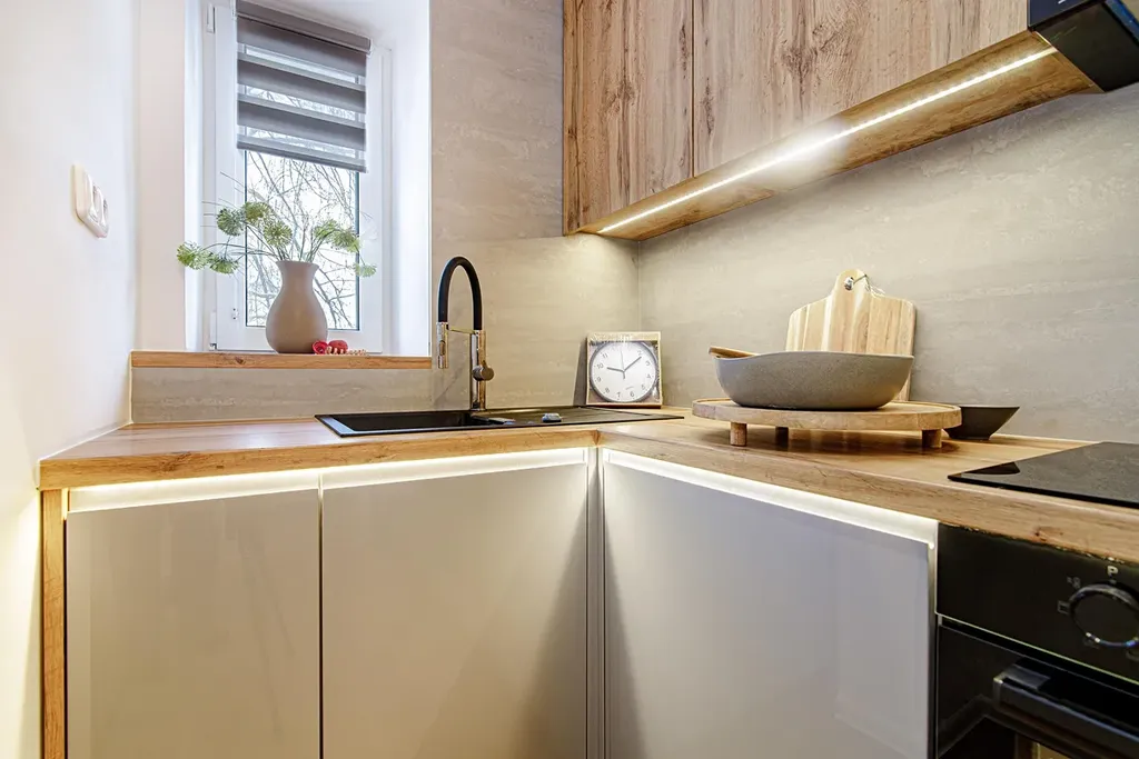 V kuchyni je nová rohová kuchyňská linka v kombinaci šedé barvy a dekoru dřeva s vestavěnými spotřebiči indukční varná deska, elektrická trouba, digestoř, plně integrovaná myčka, lednice s mrazákem.