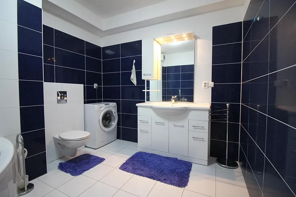 V koupelně je rohová vana, umyvadlo, koupelnové skříňky a toaleta.