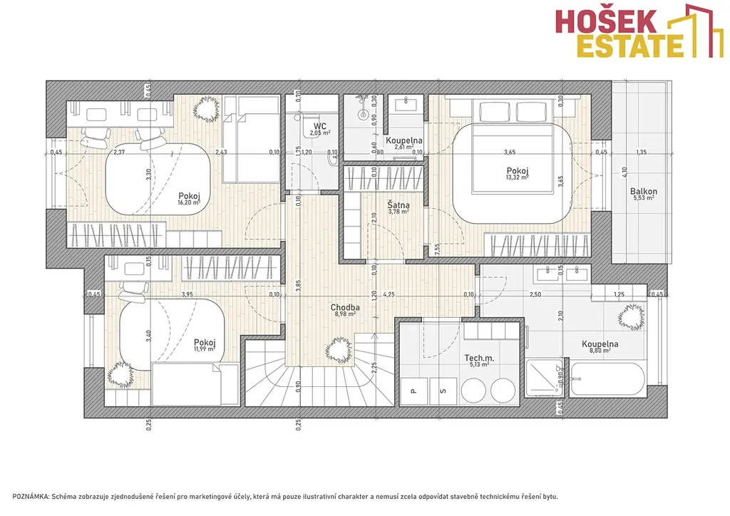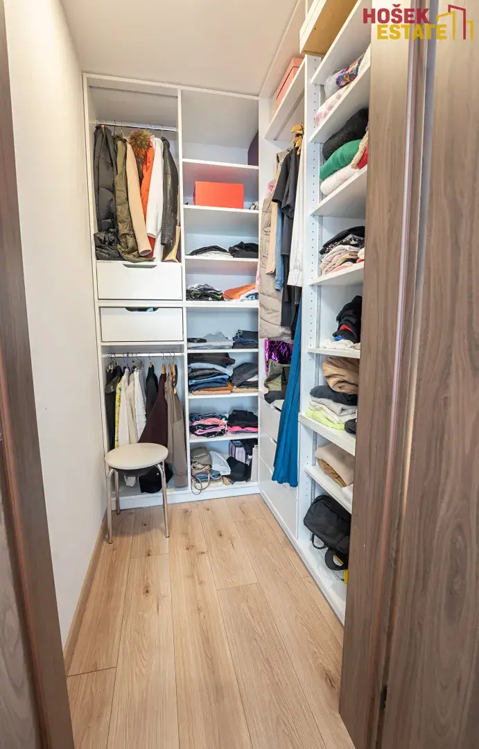 Velmi zajímavě je řešena hlavní ložnice se vstupem přes vlastní šatnu. Aktuálně je u ložnice i druhá šatna, původně to však byla koupelna, kterou zde velmi jednoduše opět vybudujete. Ložnice má i vlastní balkón.