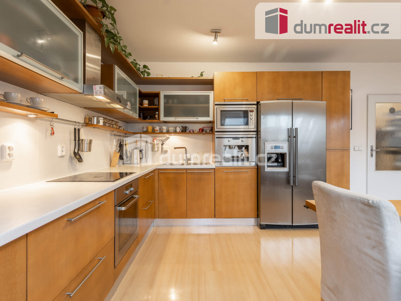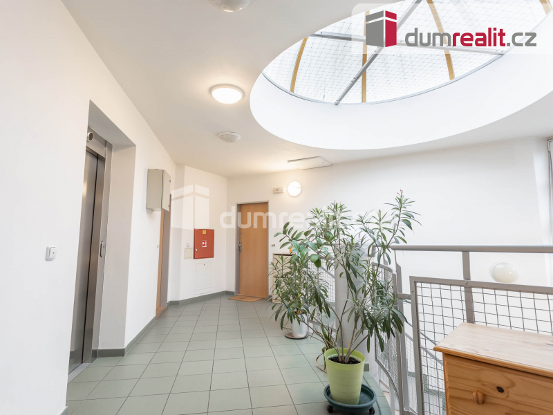 Byt disponuje užitnou plochou 62 m² v nejvyšším 6. nadzemním podlaží. Do vašeho budoucího bytu se dostanete pohodlně bezbariérově velkým výtahem a to jak z ulice, tak rovnou z garážového stání, které je součástí prodeje. Před bytem na stropu chodby je umístěna poloprůhledná střešní kopule, která nejen osvětluje celý prostor a je i skvělým a neobvyklým doplňkem interiéru domu. Vedle bytu na patře je umístěna velká sušárna prádla. Po vstupu do bytu Vás čeká větší chodba s vestavěnou skříní. Z chodby jsou samostatné vstupy do velkého obývacího pokoje s kuchyní a do ložnice. Oba prostory mají střešní okna a tedy poskytují větší soukromí a samozřejmě více přirozeného světla. Z chodby se dále vstupuje dvěma vchody do samostatného WC a do koupelny, ve které je nejen větší vana, ale která je zejména osvětlená střešním oknem, které slouží i k rychlému větrání. Kuchyň je nejen velká a vkusná, ale zejména je ve výborném stavu. Její hlavní dominantou je americká lednice. Podlahy v bytě jsou plovoucí, jen WC a koupelna jsou provedeny v kombinaci dlažby a obkladů. Velkou výhodou pro budoucího majitele bytu je možnost instalace venkovní klimatizační jednotky. Další výhodou je možnost zanechat kompletní vybavení bytu budoucímu majiteli