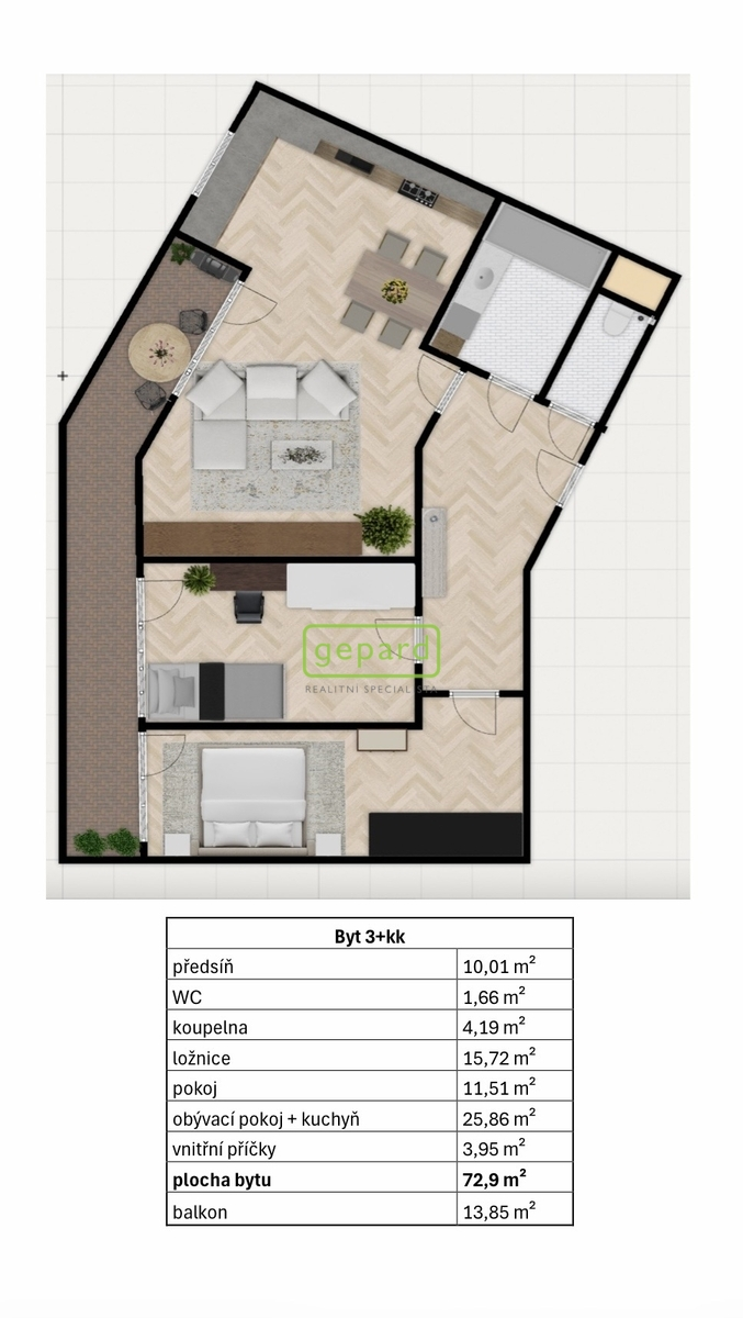 V moderním rezidenčním projektu Ekorezidence Hodkovičky nabízíme ke koupi atypický byt 3+kk o podlahové ploše 72,9 m², doplněný o velkorysý balkon 13,85 m², který se stane vaším druhým obývákem – ideálním místem pro ranní kávu, večerní sklenku vína nebo letní snídaně na slunci.
