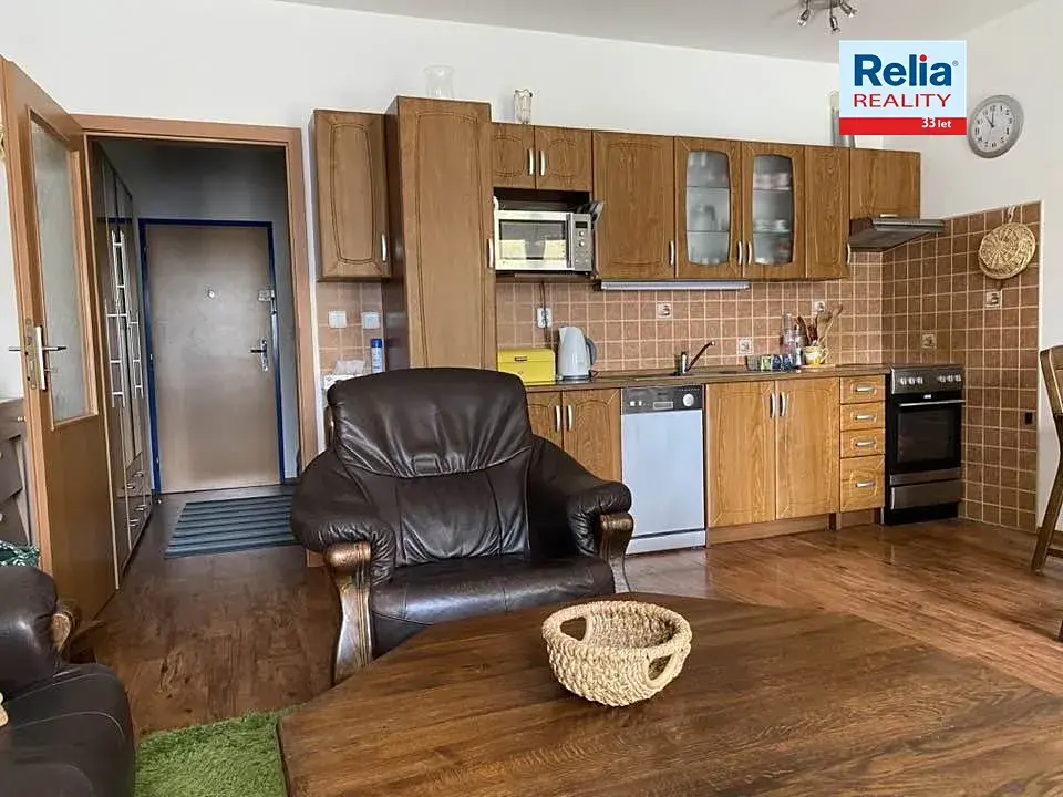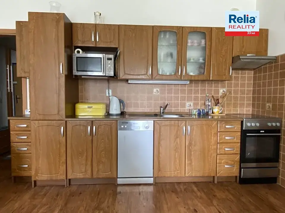Součástí ceny je i kompletní vybavení, které vidíte na fotkách. Kuchyňská linka, elektrický sporák s el. troubou, digestoř, lednice, myčka nádobí. Úložné prostory jsou řešeny obývací stěnou, komodami, šatní skříní na chodbě. Veškerý nábytek je v dobrém stavu, s péčí udržovaný.