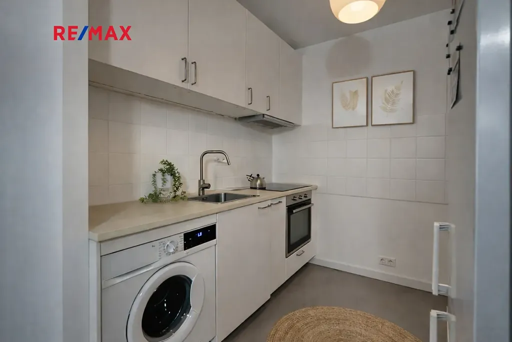 Dispozice bytu nabízí samostatnou ložnici a prostorný obývací pokoj s jídelní částí a kuchyňským koutem. Kuchyň je plně vybavena spotřebiči – elektrickou troubou, varnou deskou, digestoří, lednicí a pračkou.