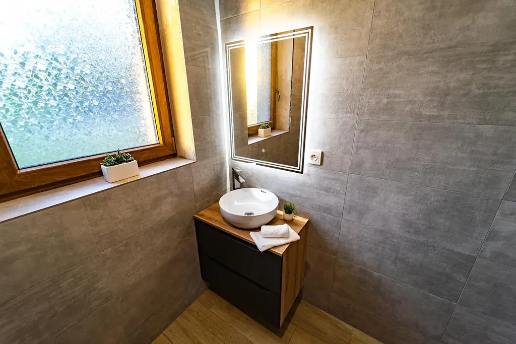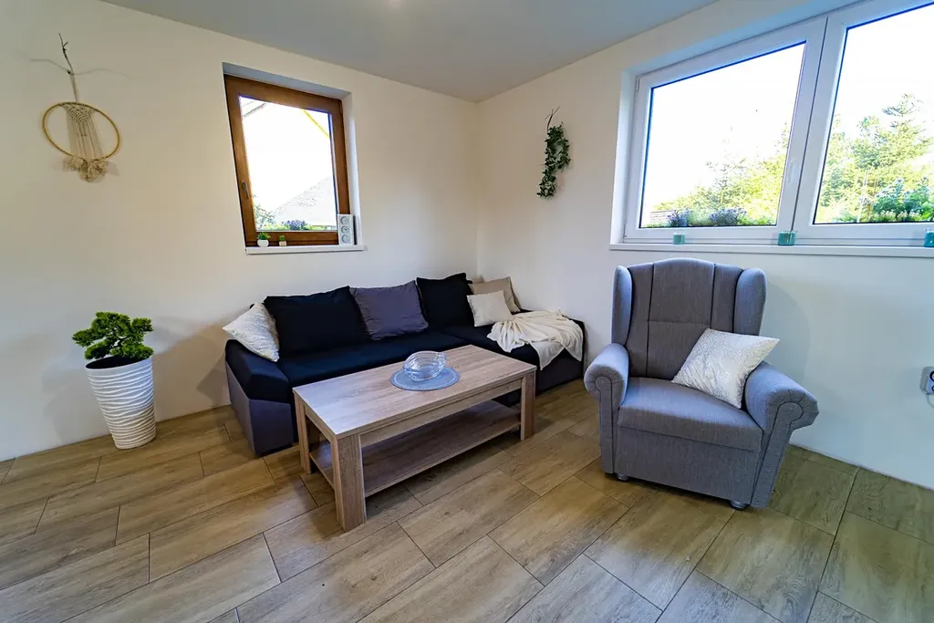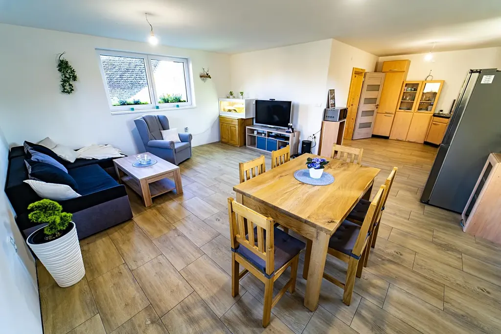 Vytápění v nemovitosti je řešeno podlahovým topením s tepelným čerpadlem umístěným za domem, aby nenarušovalo klidnou atmosféru na zahradě. Dům je připojen na obecní vodovod a kanalizaci, navíc využívá vlastní studny pro splachování a zalévání na zahradě (v domě jsou dva vodovodní okruhy). Elektřina je vedena v mědi a voda a odpady v plastu. Dům je zateplen polystyrenem o tloušťce 10 cm, průkaz náročnosti budovy PENB: skupina C. Náklady na provoz jsou přibližně 7.300,- Kč (elektřina 6.280 Kč, voda 420 Kč, internet 589 Kč).
