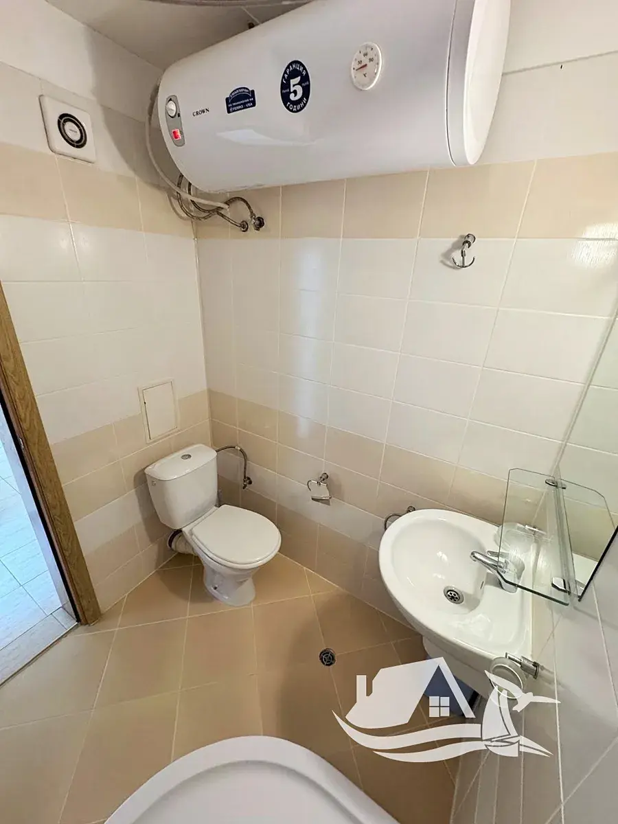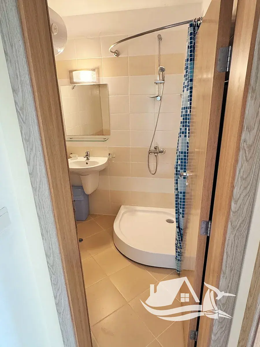 Apartmán o dispozici 2+kk a celkové ploše 55 - m² se nachází v pátém, zároveň posledním podlaží rezidenčního domu. Díky umístění v horním patře působí byt klidně a otevřeně, s dostatkem soukromí a příjemnou atmosférou. Dispozice je promyšlená a funkční – vstupní chodba přechází do obývacího prostoru s kuchyňským koutem, samostatná ložnice nabízí klid pro odpočinek a koupelna s toaletou je řešena prakticky. Terasa přirozeně rozšiřuje obytný prostor a stává se místem pro ranní kávu i večerní posezení po dni stráveném u moře.
