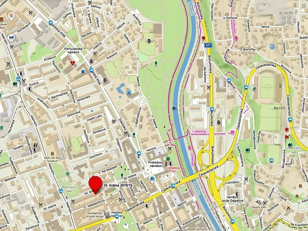 - blízko Komenského sady, nábřeží řeky Ostravice