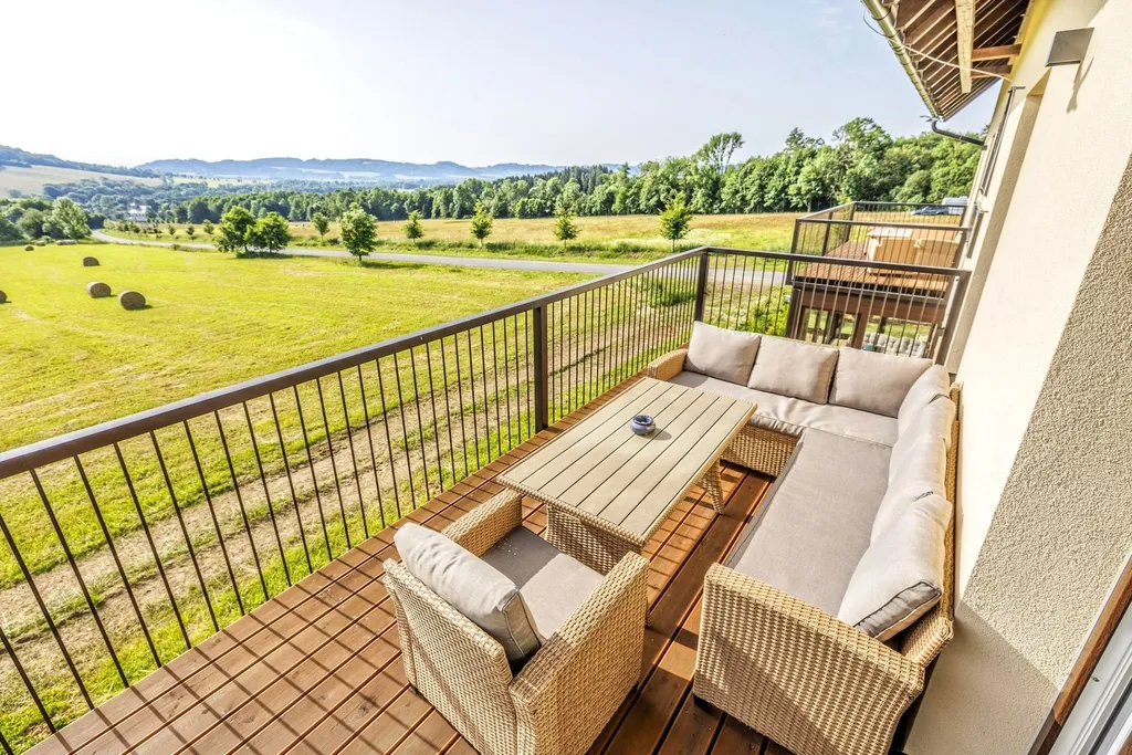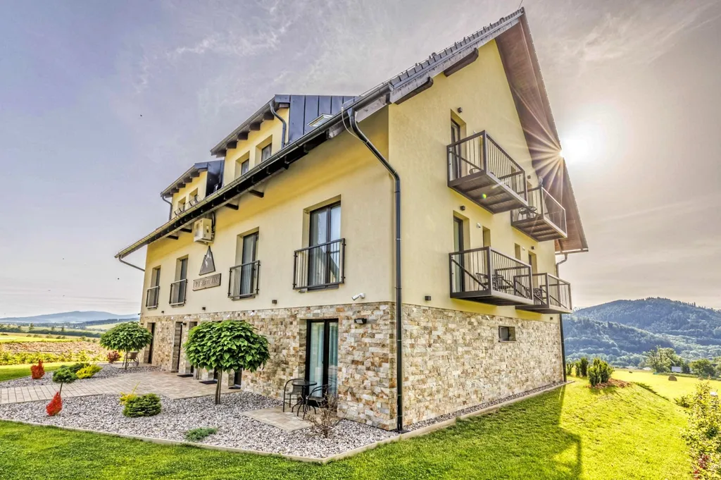 • 4× 2+kk, 45 m² – tři apartmány s balkonem, jeden apartmán s prostornou terasou (slunný výhled na svahy).
