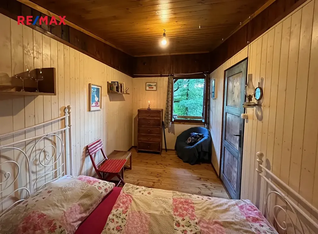 Romantický interiér nabízí obývací místnost s kuchyní a kuchyňskou linkou, stolem a židlemi, rozkládací gauč, krbová kamna. V pokoji se budete cítit jako u babičky, nebo jako na francouzském venkově... Manželská postel, obrázky, petrolejka, vůně přírody otevřeným oknem na terasu... Užitná plocha 25 m2, přivedena voda z IBC nádrže, na střeše solární panely s baterií a rozvodem po chatě na základní svícení a spotřebiče. U chaty je zbrusu nová latrína...
