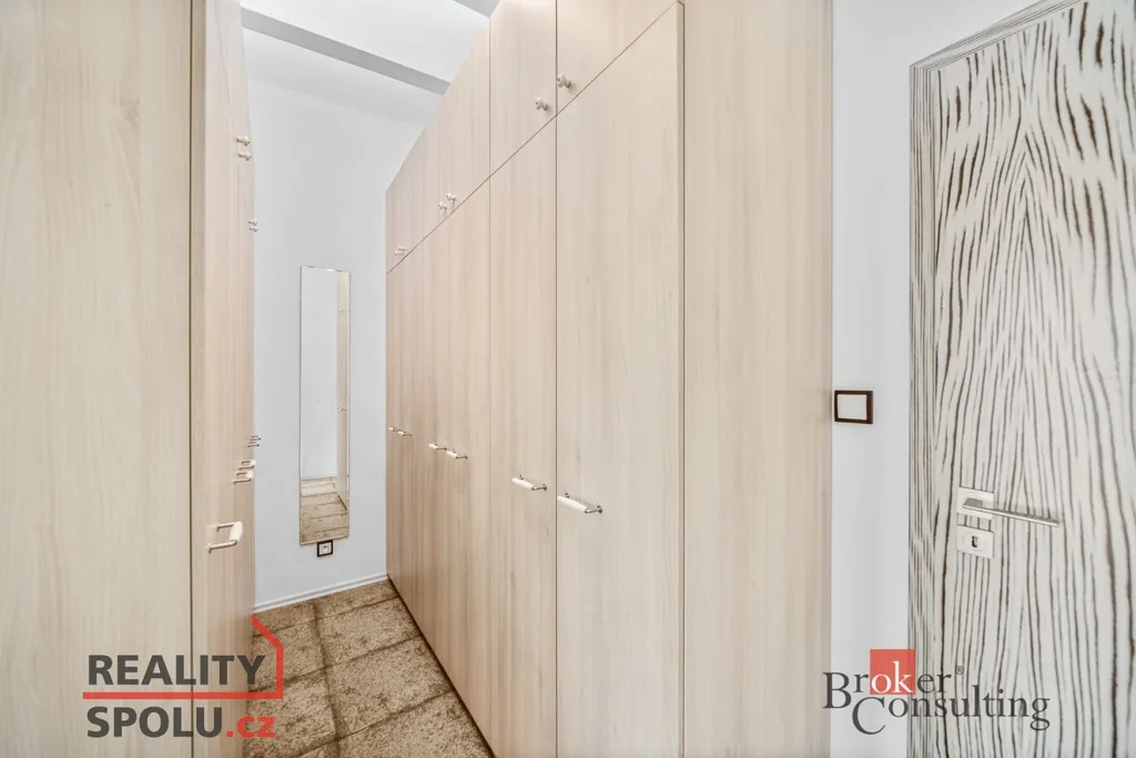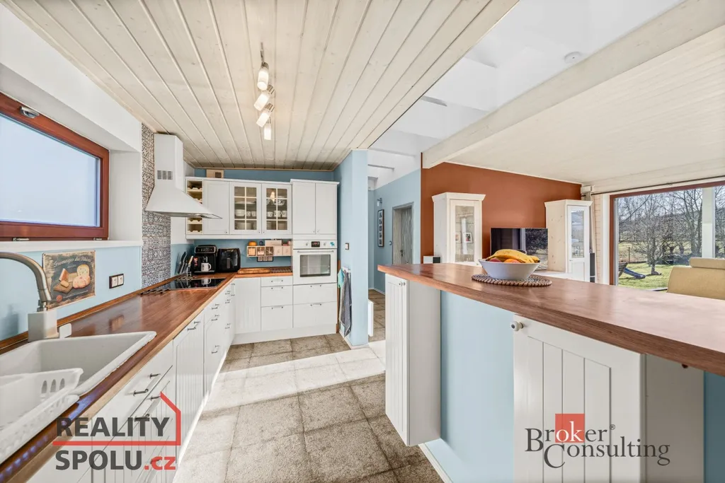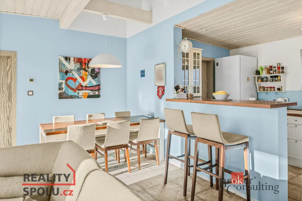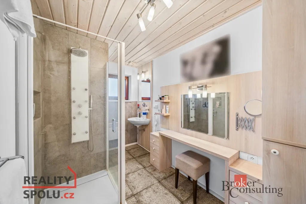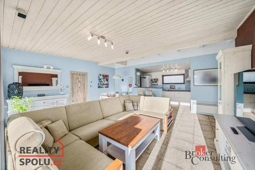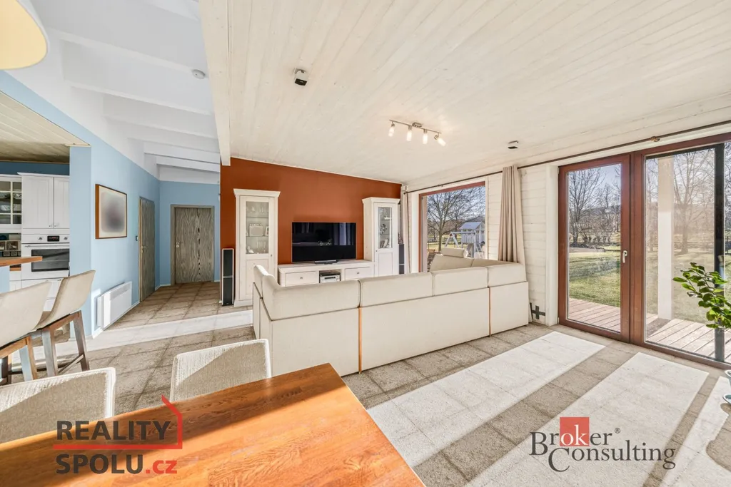 Srdcem domu je velkorysý obytný prostor s kuchyní a jídelnou, plynule navazující na zastřešenou jižně orientovanou terasu – ideální místo pro klidná rána i večerní posezení. Interiér je laděn do jednotného, nadčasového stylu s využitím přírodních materiálů, kvalitních dveří a vestavného nábytku na míru.