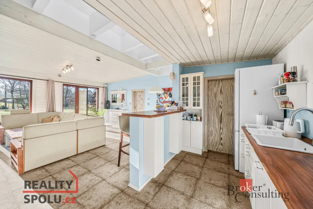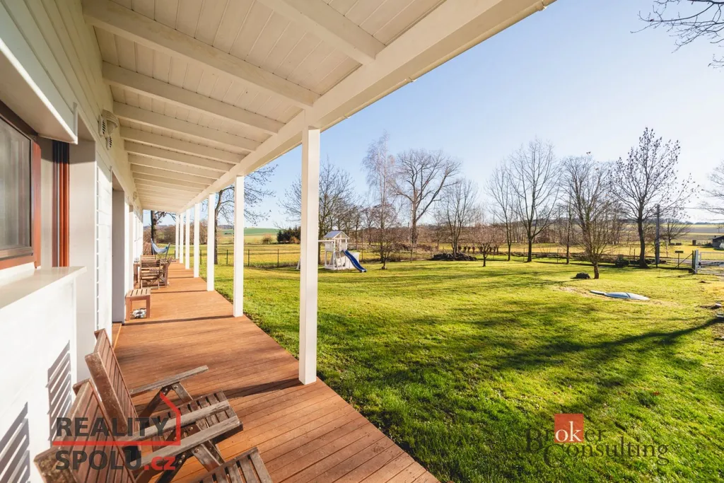 Jednopodlažní vila o dispozici 5+kk a obytné ploše 145 m² je zasazena do rozlehlého pozemku o velikosti 1 523 m² na samém okraji obce, s ničím nerušeným výhledem do zeleně okolních zahrad a luk. Promyšlená orientace ke světovým stranám zajišťuje dostatek denního světla po celý den a přirozené propojení interiéru s exteriérem.