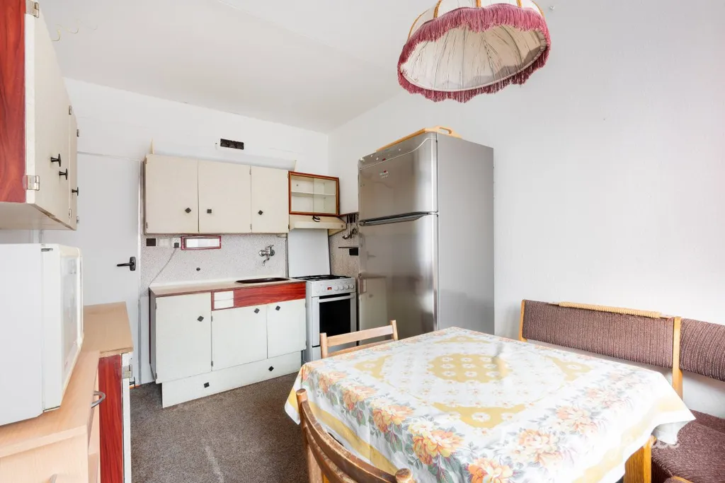Interiér je nabízen jako částečně vybavený, což vám dává ideální příležitost zařídit si domov podle vlastního vkusu. Srdcem bytu je obývací pokoj s pohodlnou sedací soupravou, televizí a úložnými prostory, na který navazuje plně vybavená kuchyně. V té najdete lednici s mrazákem, elektrickou i mikrovlnnou troubu, sporák a nechybí ani jídelní kout pro společné stolování. Další dva samostatné pokoje nabízejí variabilní využití jako ložnice, dětský pokoj nebo klidná pracovna. Koupelna disponuje vanou a pračkou, přičemž toaleta je pro maximální komfort umístěna samostatně.
