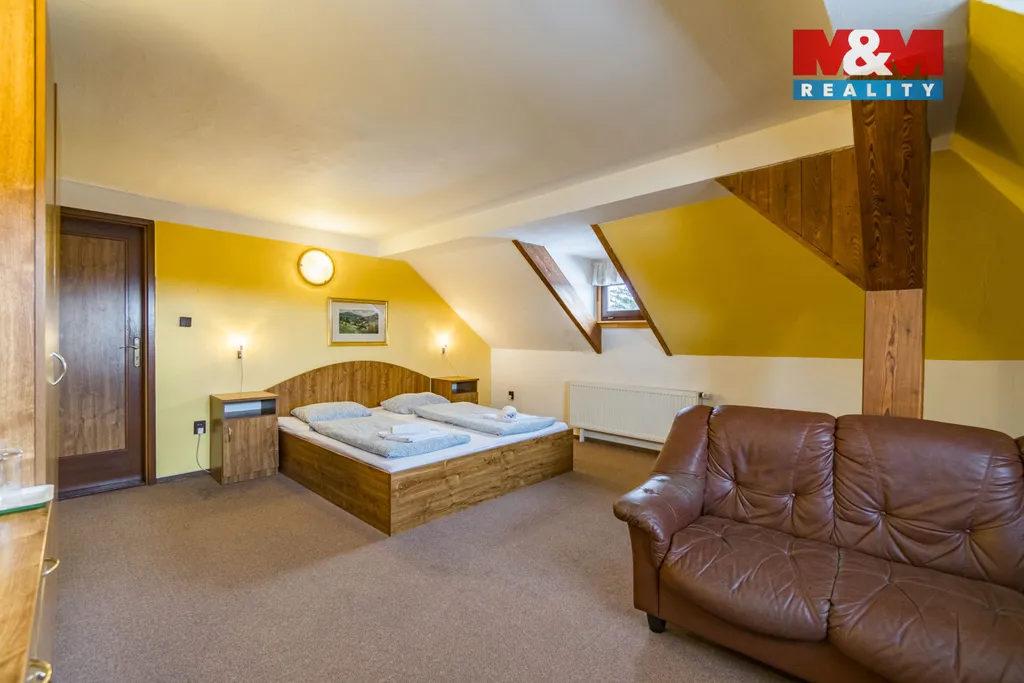 Nově Vám nabízíme za sníženou cenu k prodeji zavedený útulný hotel v lůně Rychlebských hor, v malebné obci Černá Voda, která v poslední době zažívá nebývalý rozvoj z hlediska turismu, cykloturistiky a rodinné rekreace. Hotel disponuje kuchyní, restaurací, pivnicí a venkovní zahrádkou. Ubytovací kapacita čítá 30 lůžek v pokojích s příslušenstvím. Vytápění hotelu je řešeno tepelným čerpadlem. Pozemek s celkovou výměrou 7610 m2 umožňuje výstavbu dalších vedlejších objektů, případně umožňuje jiný účel využití. Okouzlí Vás panenská příroda s čistým ovzduším, s rybníky uprostřed lesů, zatopenými žulovými lomy a dalšími turisticky atraktivními místy. V této nemovitosti vidím velký potenciál. Nemovitost můžete převzít a hotel začít ihned provozovat. V ceně nemovitosti je totiž veškeré vnitřní vybavení a zařízení. Je to ideální místo pro rekreaci a relaxaci. Pro více informací a termín prohlídky mne neváhejte kontaktovat. S financováním rádi poradí naši hypoteční specialisté.