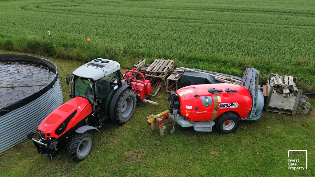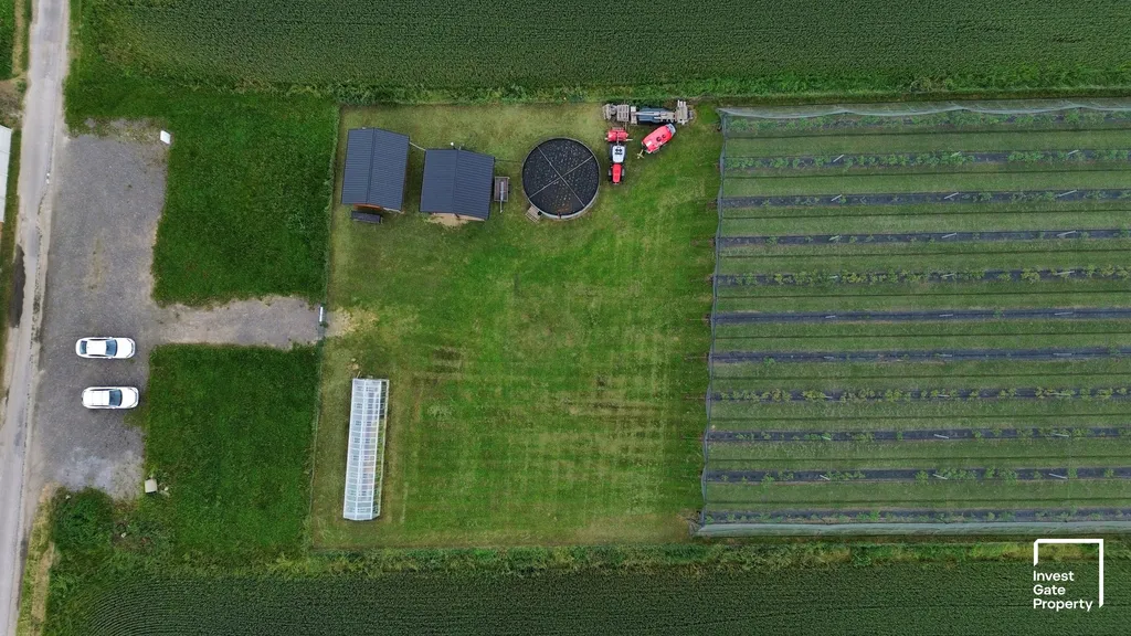 Technologické zázemí farmy je situováno do dvou provozních budov v přední části pozemku, kde je umístěn chladící box, sklady a technologie závlahy a hnojení. Na tyto stavby navazuje nádrž na vodu z vrtu o kapacitě 30 m3, ze které je potom rozvedena závlaha po celé ploše farmy v několika samostatných okruzích. V přední části farmy je také skleník s přilehlým prostorem, který je možné využít pro umístění například mobilheimu.