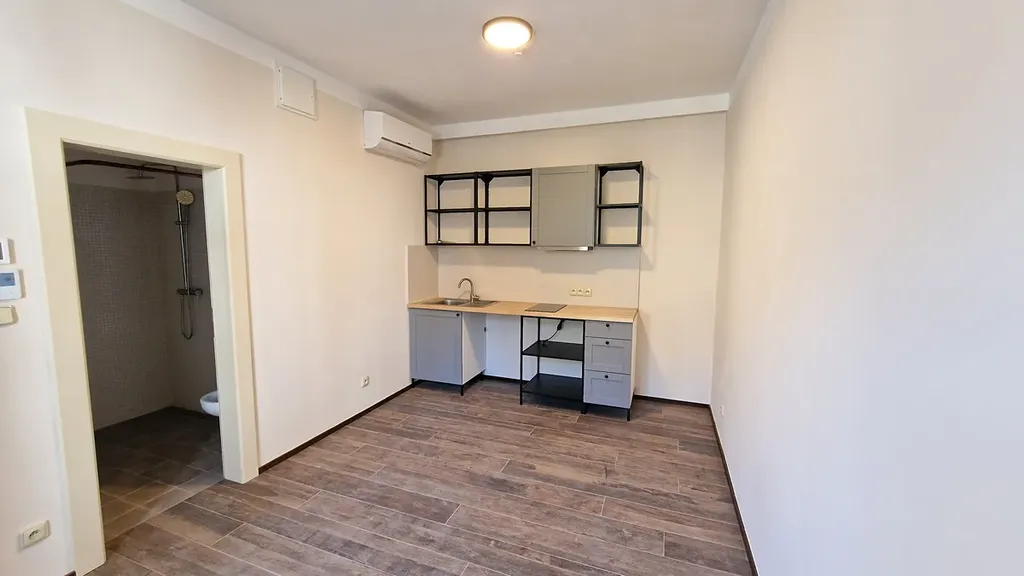 V bytě se topí elektrikou a je i klimatizovaný. Vybavený kuchyňskou linkou a samozřejmě koupelnou.