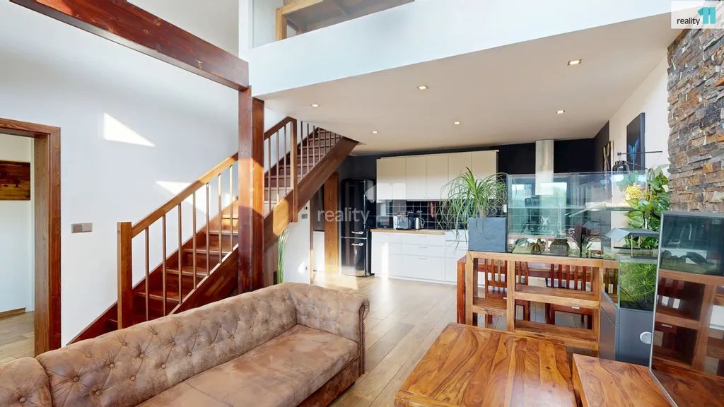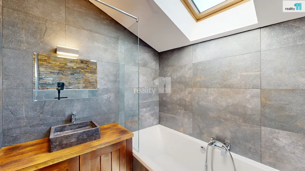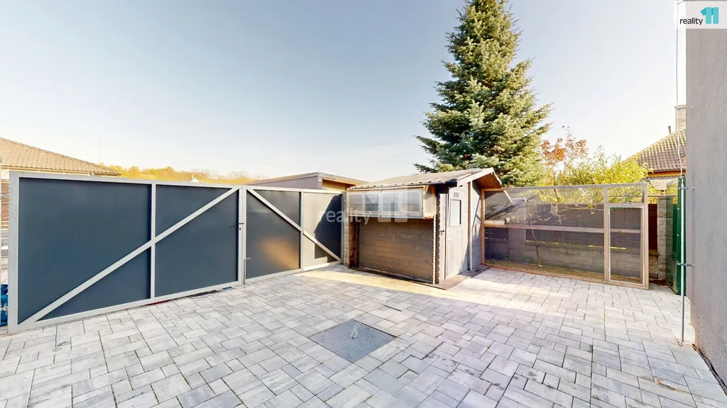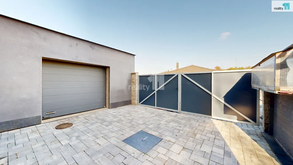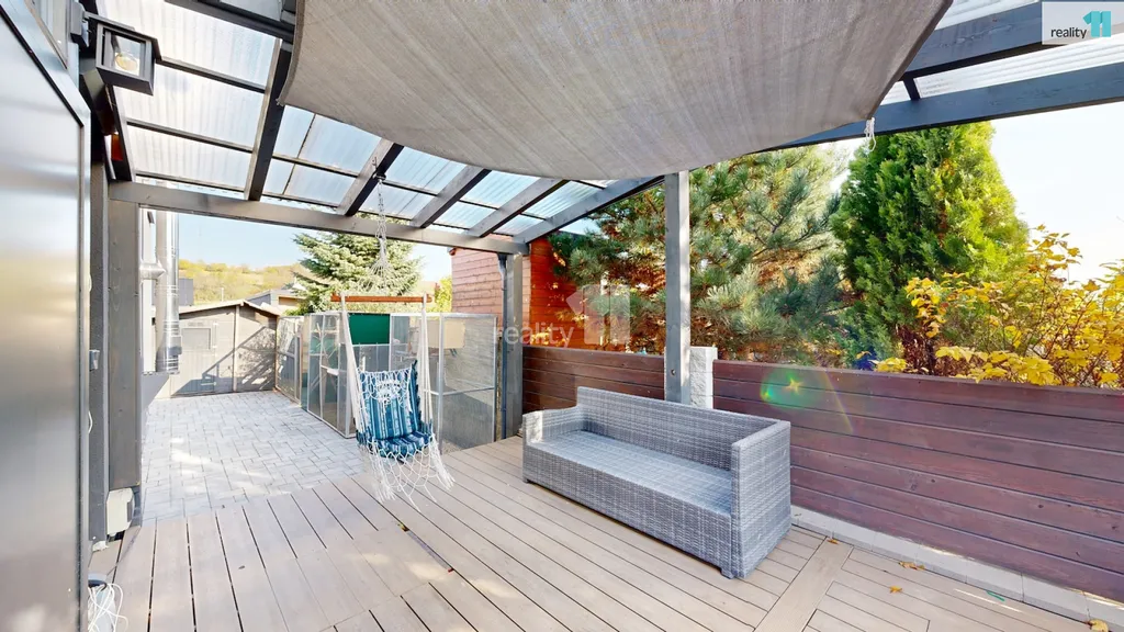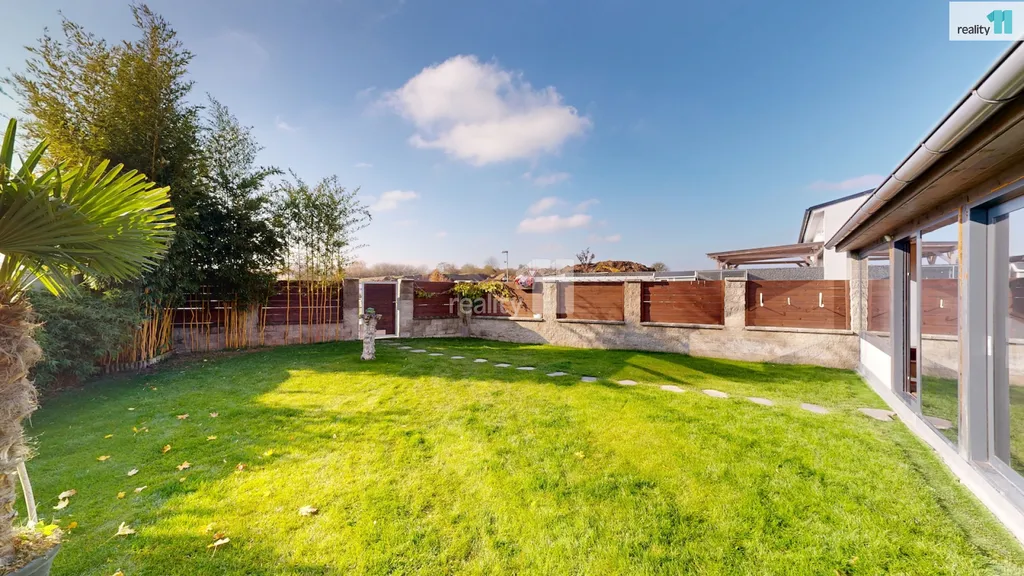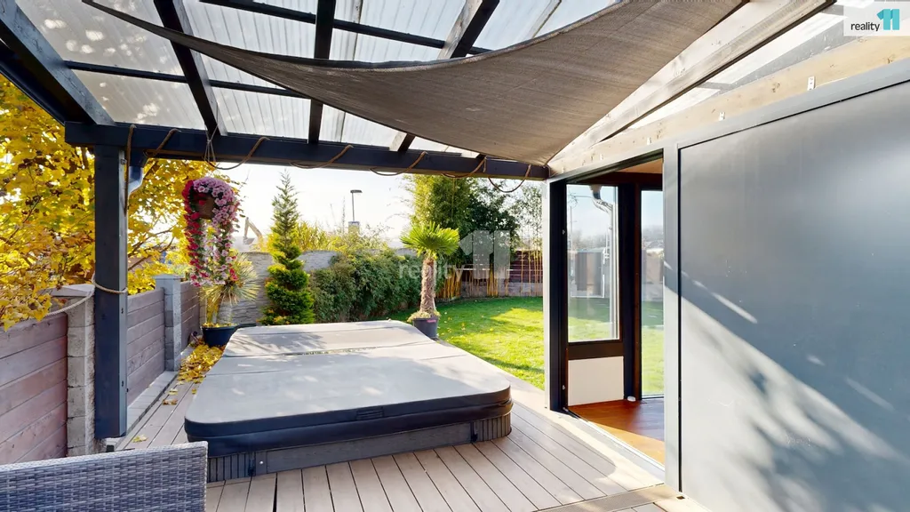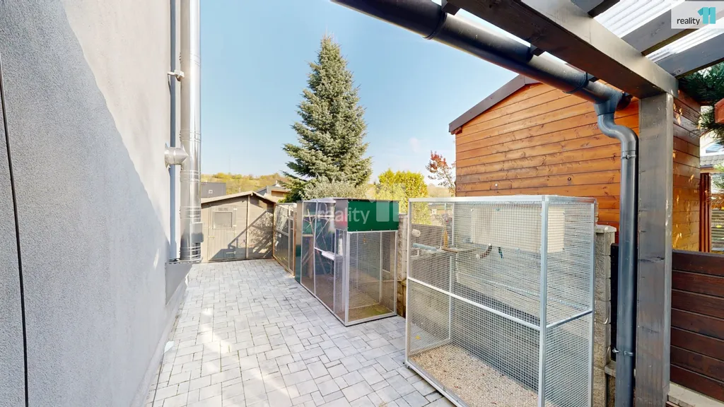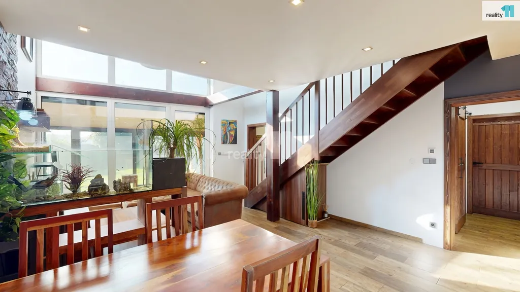 Dvě ložnice a hlavní koupelna s vanou Vás čekají v patře, kam se dostanete po dřevěných schodech. Pokud by nový majitel potřeboval, dá se přistavět ještě další pokoj nad střechu garáže, při jejíž výstavbě se s touto variantou počítalo. Dům je plný světla, i díky jedné stěně, která je kompletně prosklená. Jsou zde kvalitní podlahy, obklady i sanitární technika, podlahové elektrické vytápění, klimatizační jednotky. Majitelé nad zařízením důsledně přemýšleli, aby v domě byl dostatek úložných prostor a byl pohodlný, takže jsou využity i prostory pod schodištěm a další zákoutí. Zimní zahrada má přípravu i pro případné umístění krbových kamen. Terasa slouží zejména pro relaxaci, grilování, posezení a rozděluje zahradu na přední a zadní část. Přední část je travnatá, s automatickou závlahou, s několika okrasnými keři a slouží zejména pro děti. Zadní část je vydlážděná, vhodná pro parkování, kutilství nebo trénink na koš? Je zde také menší technický domek (nemusí zůstat), i když v garáži je opravdu dost prostoru.