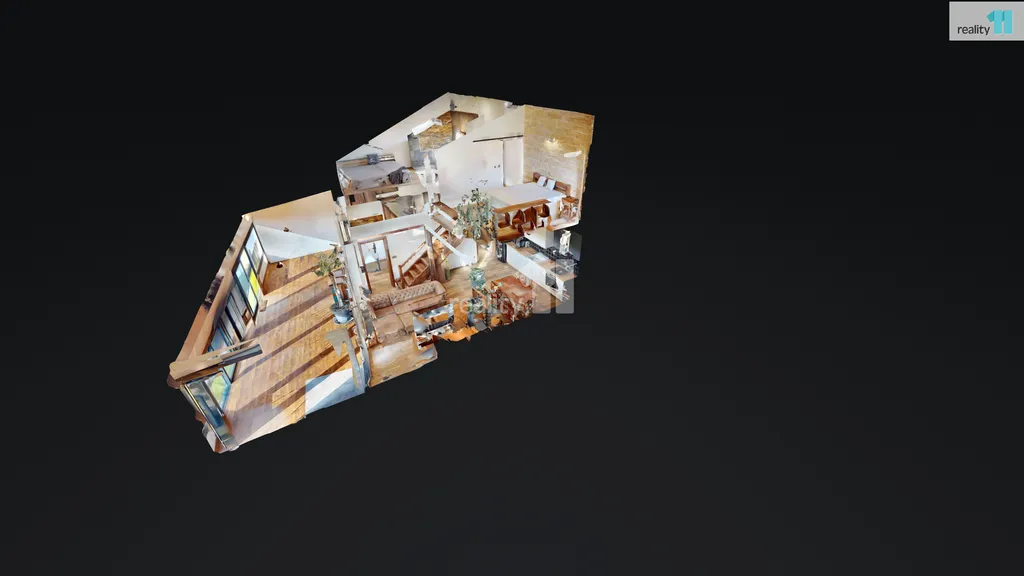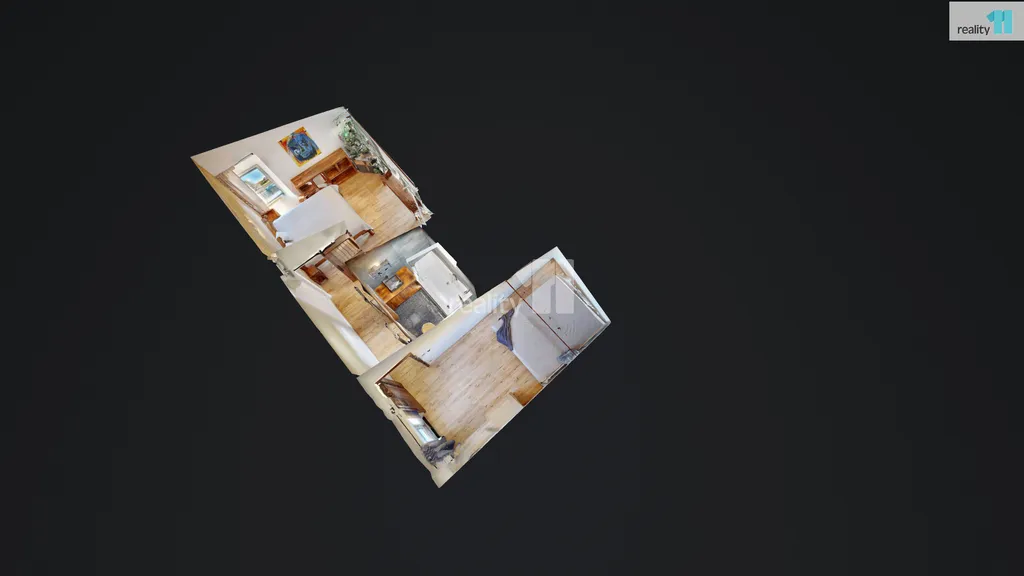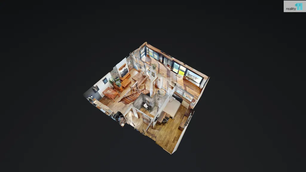 Má skvělou dispozici - z podlouhlé velké zimní zahrady, která je využívána jako pracovna a druhý obývací pokoj, se vchází do zádveří s velkou vestavnou skříní na boty a kabáty. Odtud pak do obývacího pokoje s kuchyňským koutem (velká kuchyňská linka, prostor pro jídelní stůl i rohovou pohovku), který je útulným centrem pro setkání s rodinou a přáteli. Z obývacího pokoje se vchází do menší chodby, s praktickým výklenkem na technické zázemí (kotel, pračka, sušička a mnoho polic), vstupem do koupelny se sprchovým koutem, a do ložnice (studentského pokoje) s dalšími skříněmi.