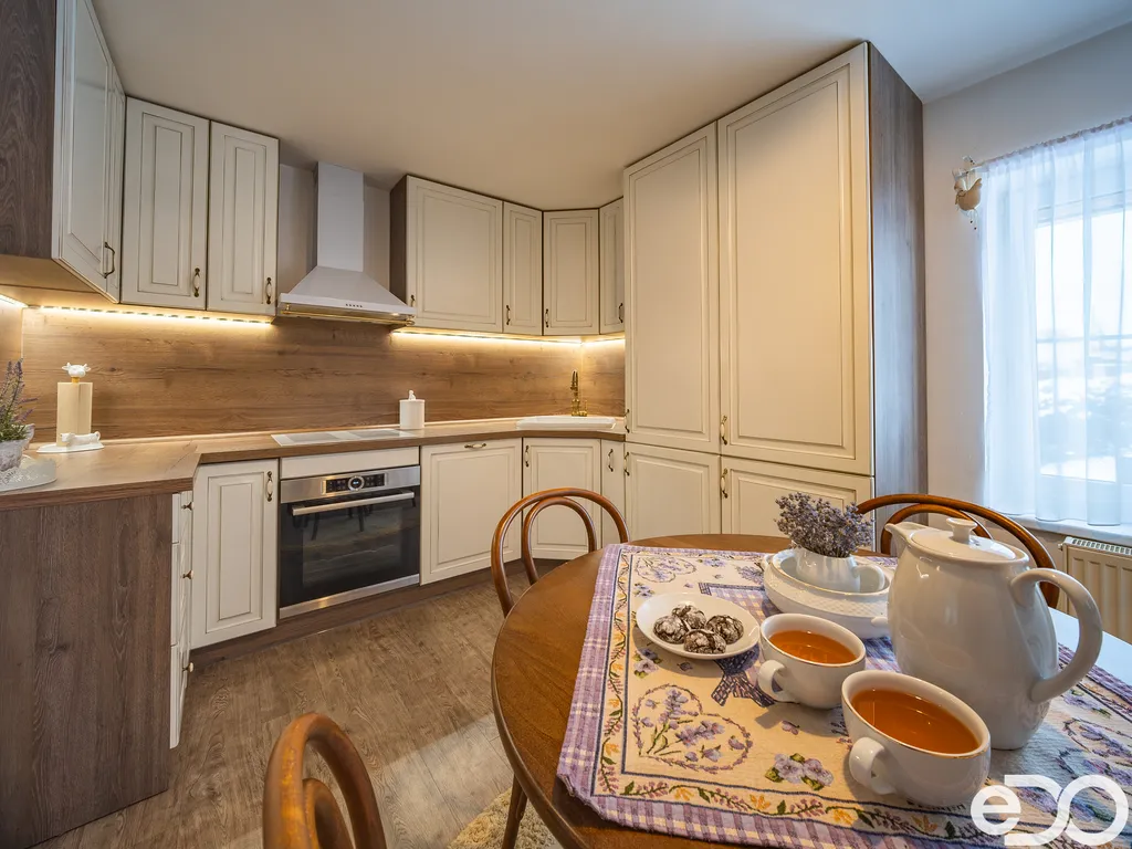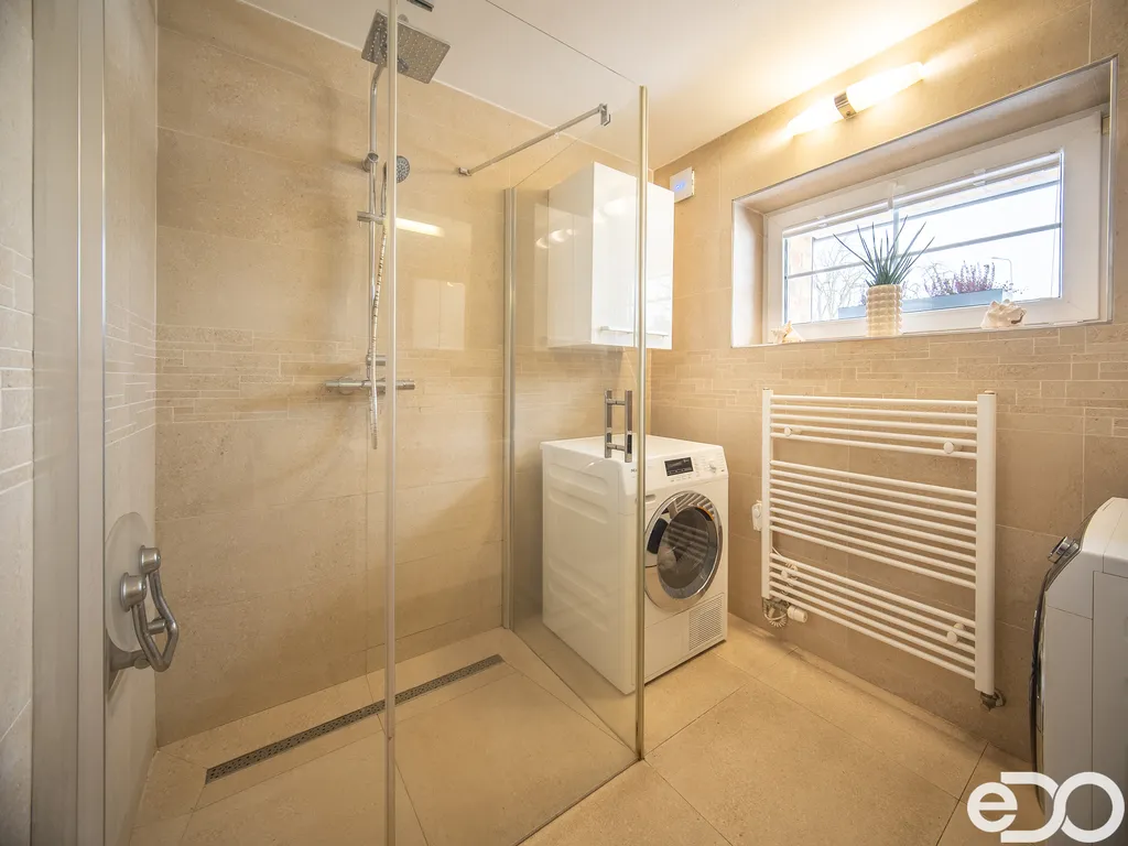 Z verandy dále mohu pokračovat na toaletu s plynovým kotlem, do koupelny se sprchovým koutem a prostorem pro pračku a sušičku. Dále se dostávám do plně vybavené kuchyně na míru opět v nadstandardním provedení s jídelním stolem a navazujícího velkého obývacího pokoje.