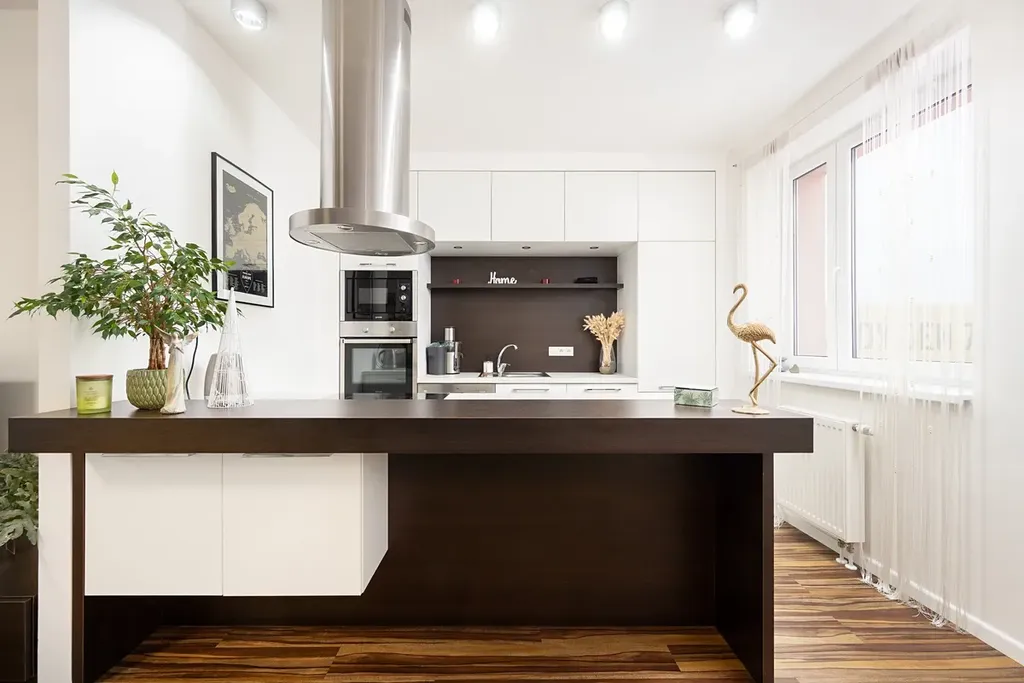 Dominantou prostorného, jižně orientovaného pokoje je krásná a plně vybavená kuchyně s praktickým členěním. Je zde lednice s mrazákem, mikrovlnná a horkovzdušná trouba, myčka, sklokeramická varná deska a digestoř.