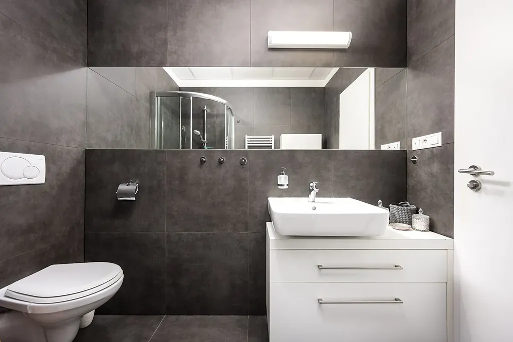 V koupelně s toaletou je sprchový kout, pračka se sušičkou a topný žebřík.