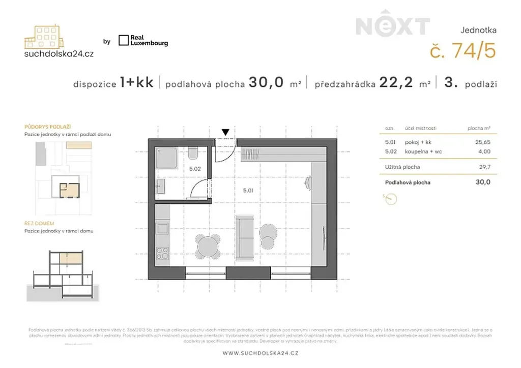 Jednotka se skládá z pokoje s přípravou pro kuchyňskou linku o ploše 25,65 m² a kompletně zařízenou koupelnou s toaletou a podlahovým vytápěním o ploše 4,00 m².