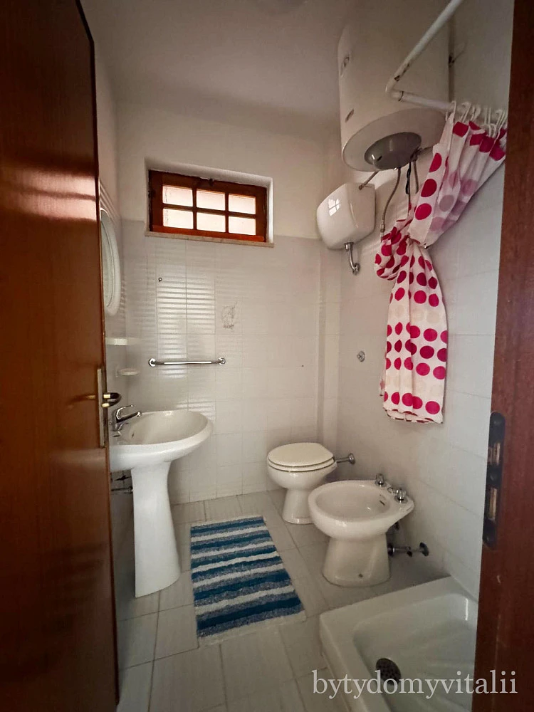 Velký apartmán se nachází na Via Magna Grecia. U bytu jsou 2 balkony, jeden s výhledem na hory a druhý s výhledem na moře. U domu je předzahrádka a vlatní parkovací místo. Byt je světlý a vybavený kuchyňským koutem se sporákem, pračkou a nábytkem. Byt je v prvním patře.