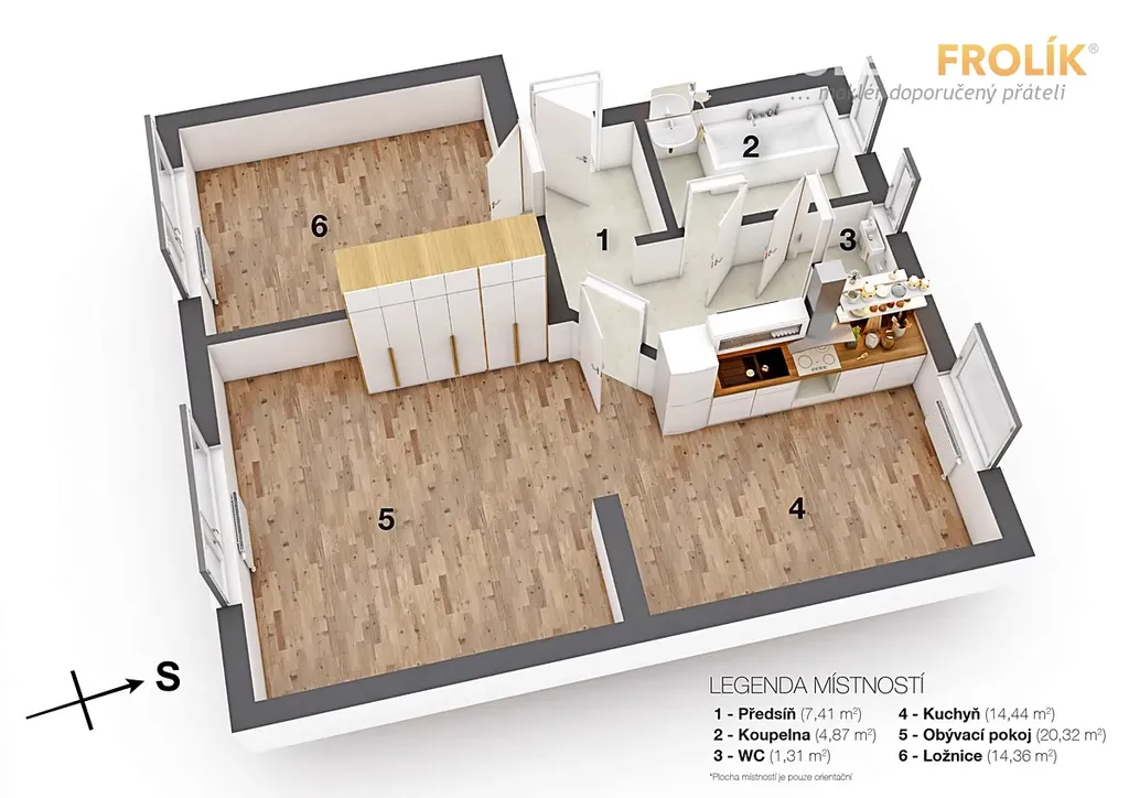 Obývák i ložnice jsou otočené na jih, kuchyně a koupelna na sever. Všechny místnosti mají okna, takže byt se dá dobře větrat. Topení a ohřev teplé vody je dálkové, vše s měřením. V kuchyňské lince jsou všechny spotřebiče: lednice s mrazákem, elektrická trouba, sklokeramická varná deska, digestoř, myčka. Potřebujete jen vlastní nábytek a pračku.