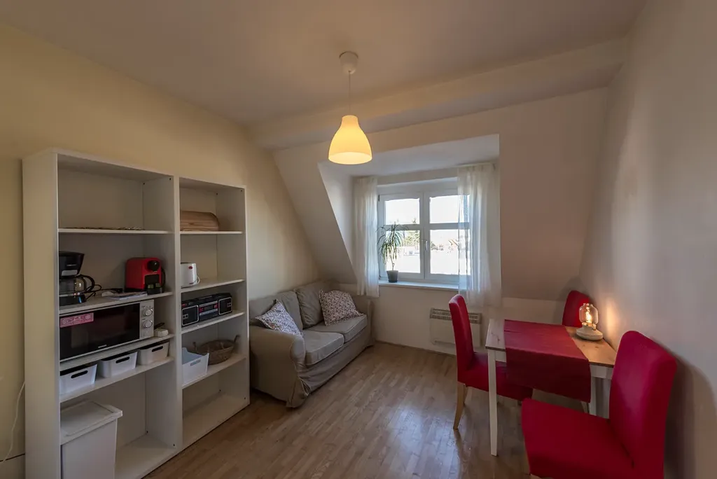 Nabízíme k pronájmu světlý byt 1+1 ve 3. patře rodinného činžovního domu, 46 m2. Byt je kompletně vybavený nábytkem a spotřebiči. V kuchyni linka, elektrický dvouvařič, lednice, mikrovlnná trouba, kávovar, stůl, židle, pohovka, police. Koupelna s vanou, bojler na ohřev vody, umyvadlo, pračka. Samostatné WC. V ložnici manželská postel, pracovní stolek, židle, TV. Šatní skříň, poličky. Podlahy - dřevěné a dlažba. Vhodné pro 1 os nebo pár.