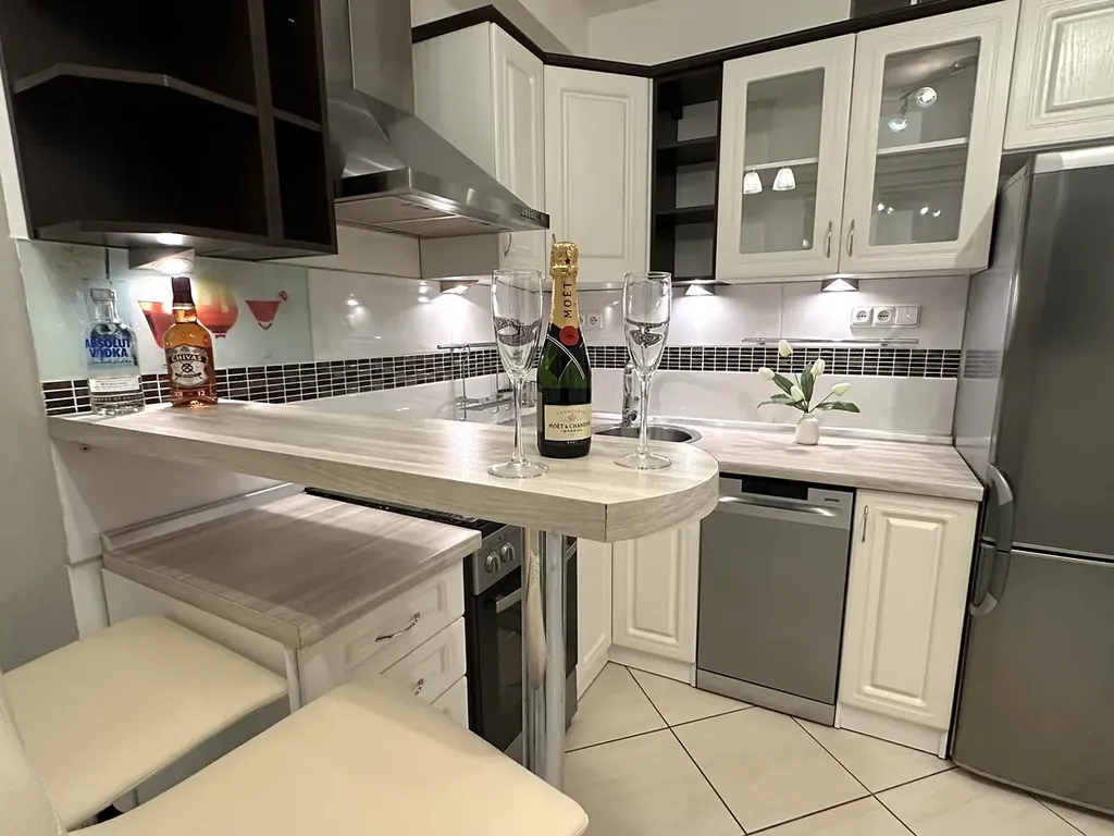 moderní kuchyňskou linku se spotřebiči (myčka, lednice) a barový pult – perfektní pro ranní kávu i večerní sklenku,