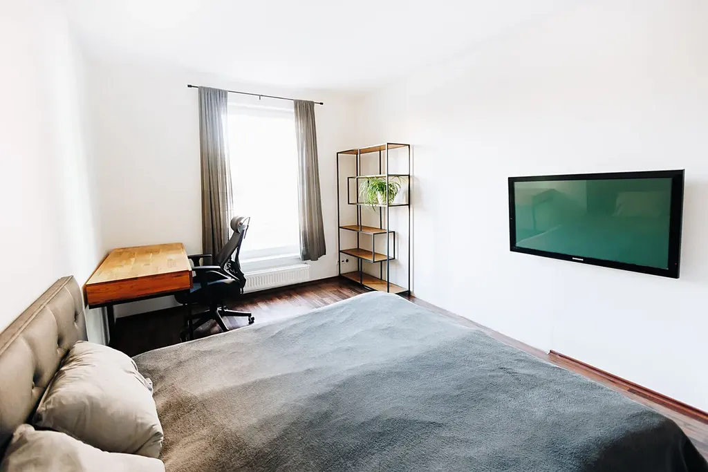 Byt má velmi zdařilou dispozici. Díky velkým oknům je světlý, ložnice i obývací pokoj jsou orientovány na východ, takže od rána do oběda budete mít dostatek slunce. Na obývací pokoj navazuje částečně oddělená kuchyň vybavená troubou, varnou deskou, myčkou, digestoří a lednicí. V bytě je výborná zvuková izolace, sousedy budete mít pouze z jedné strany a nad sebou. V prostorné koupelně je sprchový kout a toaleta. Na podlahách v pokojích je kombinace plovoucí podlahy (ložnice, obývací pokoj, kuchyňský kout) a dlažby (koupelna, předsíň). Topení a ohřev vody jsou centrální. Z oken je výhled do zahrady. Parkování je možné před domem, v této lokalitě nejsou zóny placeného stání. V domě je kamerový systém a k dispozici je také společná kolárna.