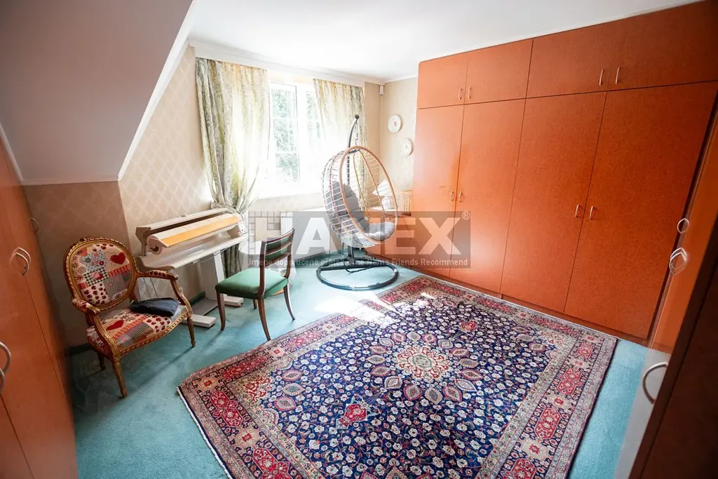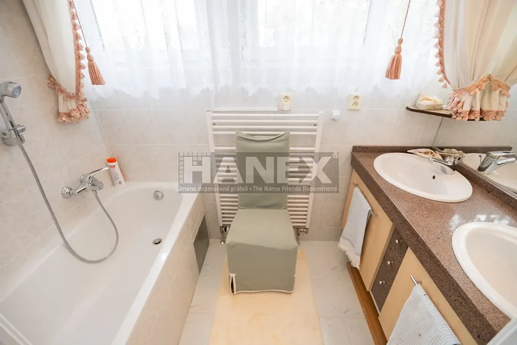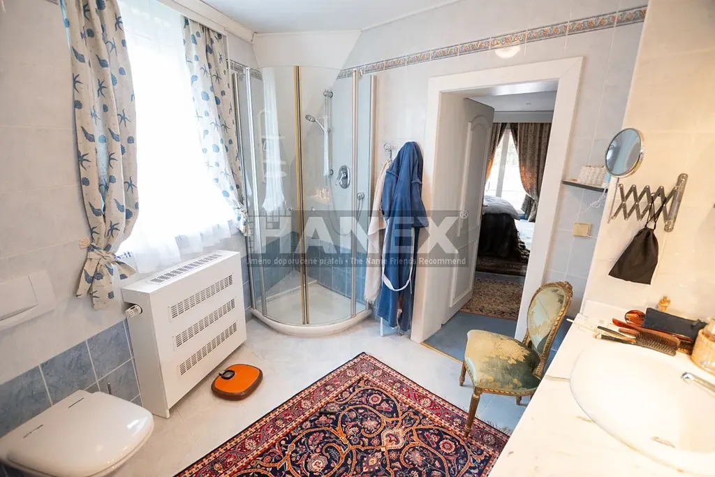 V patře je hlavní ložnice se šatnou, vlastní koupelnou a balkonem 11 m2, pokoj pro hosty se šatnou a koupelnou, další dva pokoje, koupelna a toaleta.