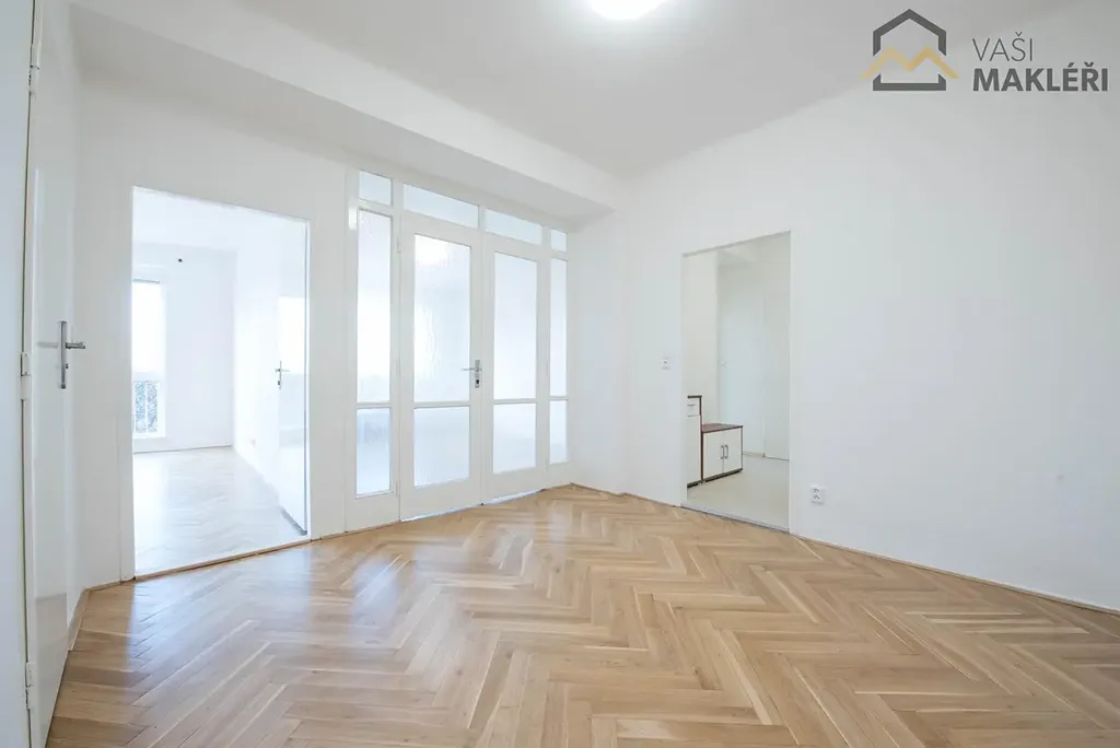 Byt zaujme především svou vzdušností, vysokými stropy, velkými okny a netradiční dispozicí. Interiér prošel citlivou rekonstrukcí s respektem k původním materiálům. Dispoziční řešení 2+1 je doplněno o přijímací halu a další praktické příslušenství spíž, komoru v bytě, sklep. Kuchyň je řešena jako samostatný, plnohodnotný prostor s možností jídelního koutu a je zapotřebí dobudovat kuchyňskou linku dle vlastních preferencí.